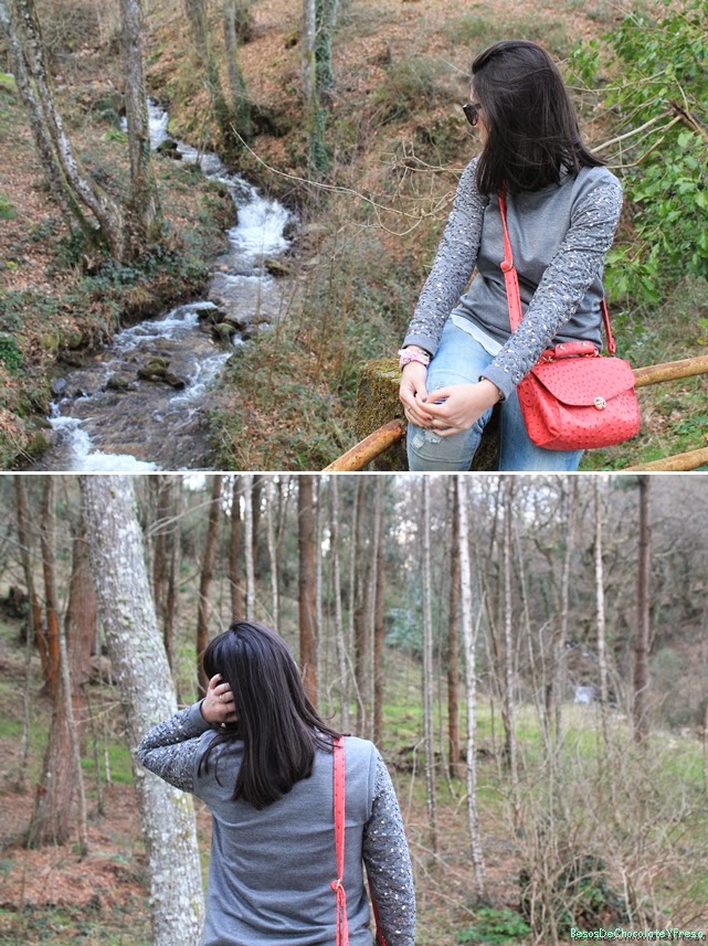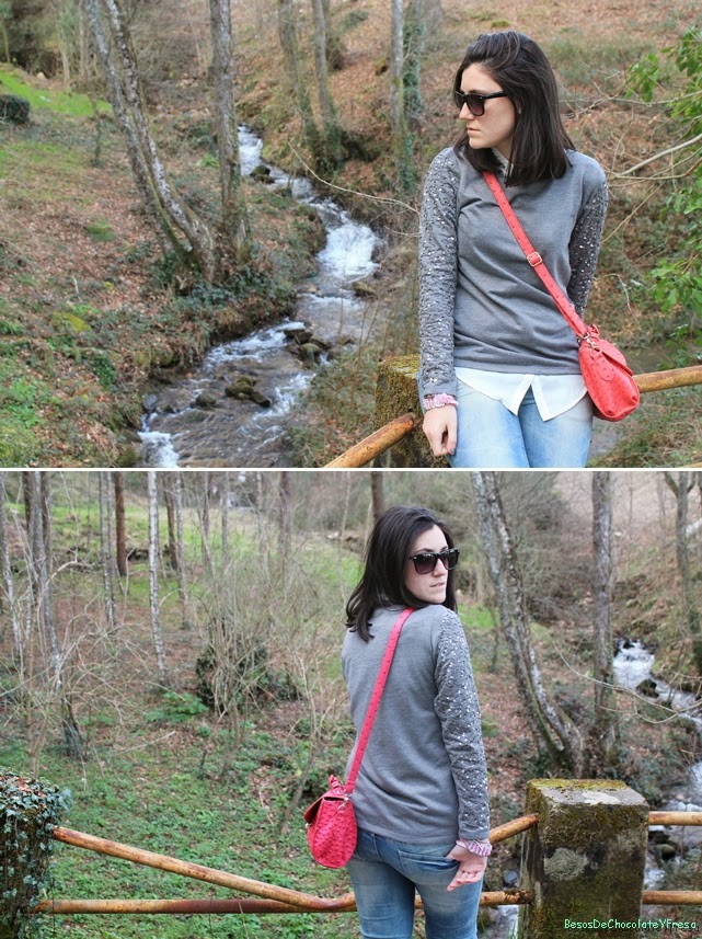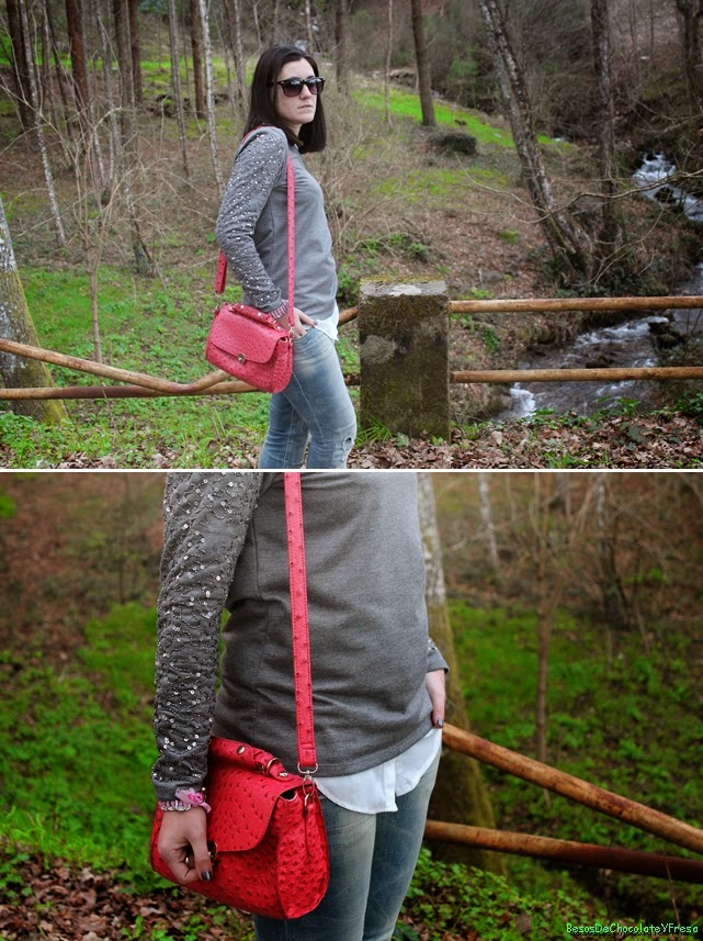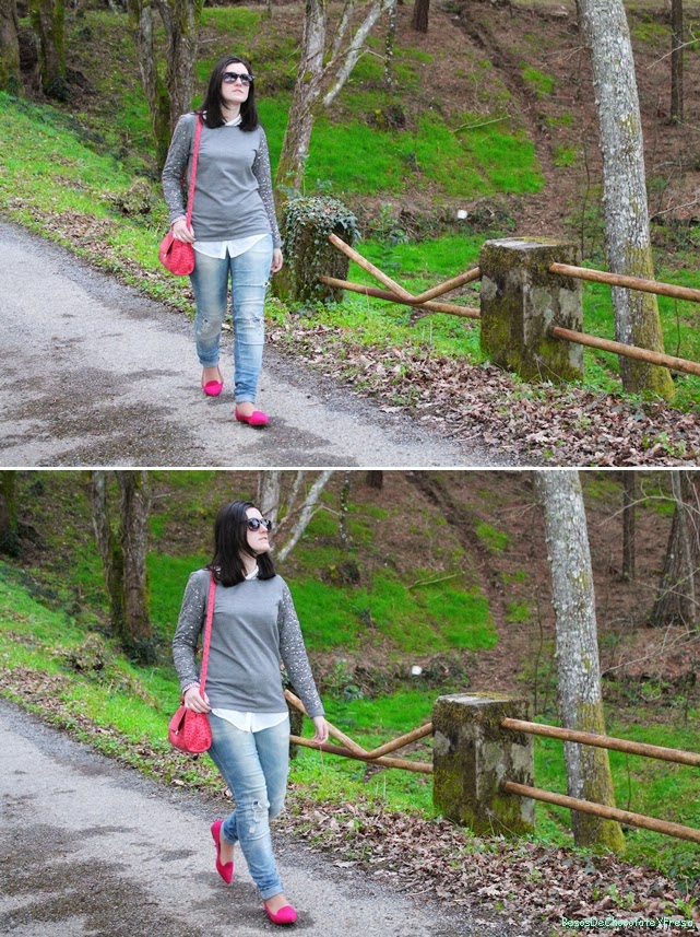 Today I"m a look made ??up my new slippers Russian fuchsia color, super comfy and easy to combine and this time I decided to take them with gray. Wear gray sweater with glitter sleeves and jewel neck white shirt, ripped jeans and matching slippers with pink handbag in ostrich skin.