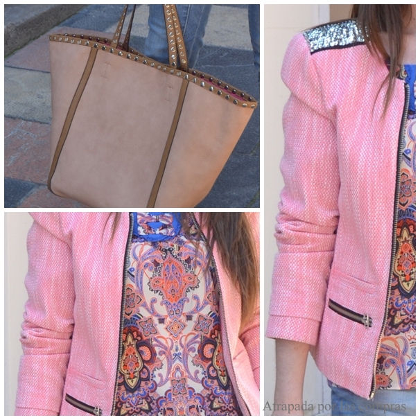 Y eso es lo que me ha pasado con la chaqueta que os enseño en el look de hoy, una chaqueta rosa de VILA cuyo tono me parece muy favorecedor y los apliques que lleva en los hombros hacen de ella una pieza diferente y original. La he combinado con un top de distintos tonos que contrastan genial con el rosa de la chaqueta chaqueta y un vaquero baggy, el primero que tengo de este tipo y con el que me siento super cómoda. Como no, no podía faltar un shopping bag, el bolso ideal para ir a trabajar, coge de todo y si os fijáis el forro también es rosa.