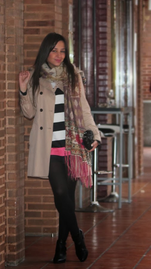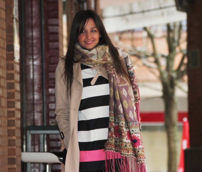 Adoro los vestidos de rayas, tanto para invierno como verano me parecen que pueden dar mucho juego y dan cabida a infinidad de looks y también de estilos. En mí caso, muy en mí linea, sin arriesgar y con mí pashmina preferida. El detalle de una franja en color rosita me encantó ya que lo convierte en una pieza especial y de cara a primavera se me ocurren combinaciones geniales. ¿Os gusta?