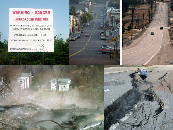Es una ciudad de Pensilvania, EEUU. La ciudad fue abandonada poco a poco al incendiarse en 1962, y no apagarse desde entonces, una vieja mina de carbón que sigue ardiendo debajo de la ciudad. El yacimiento tiene carbón para seguir ardiendo 250 años más. Como curiosidad, sirvió de inspiración para la serie de videojuegos Silent Hill.