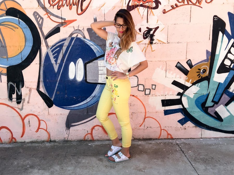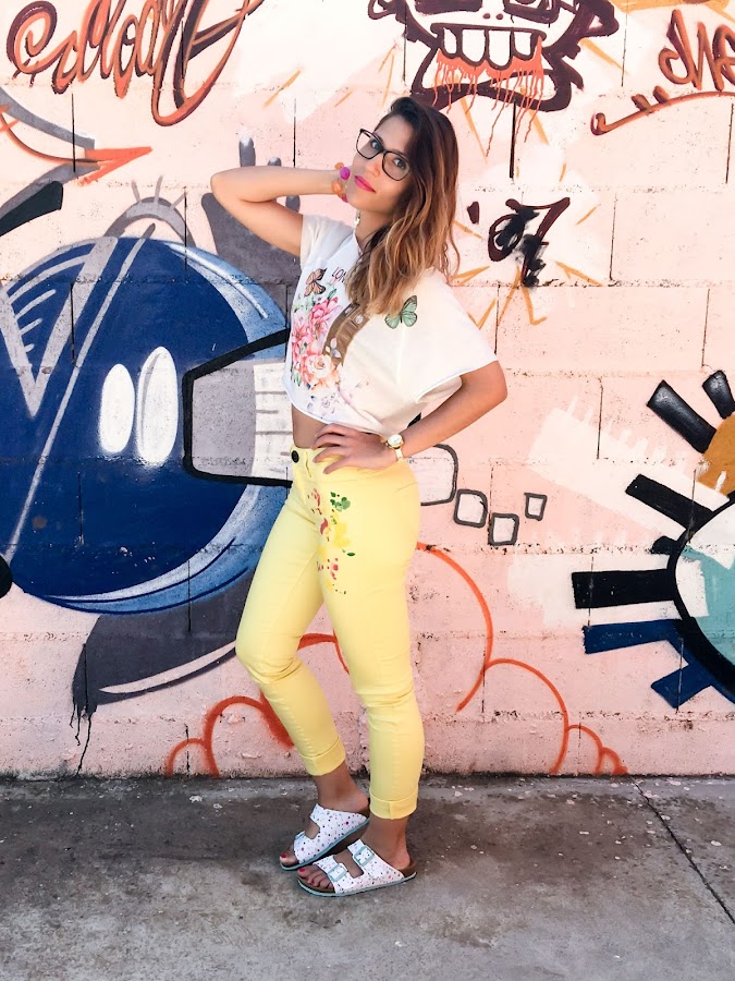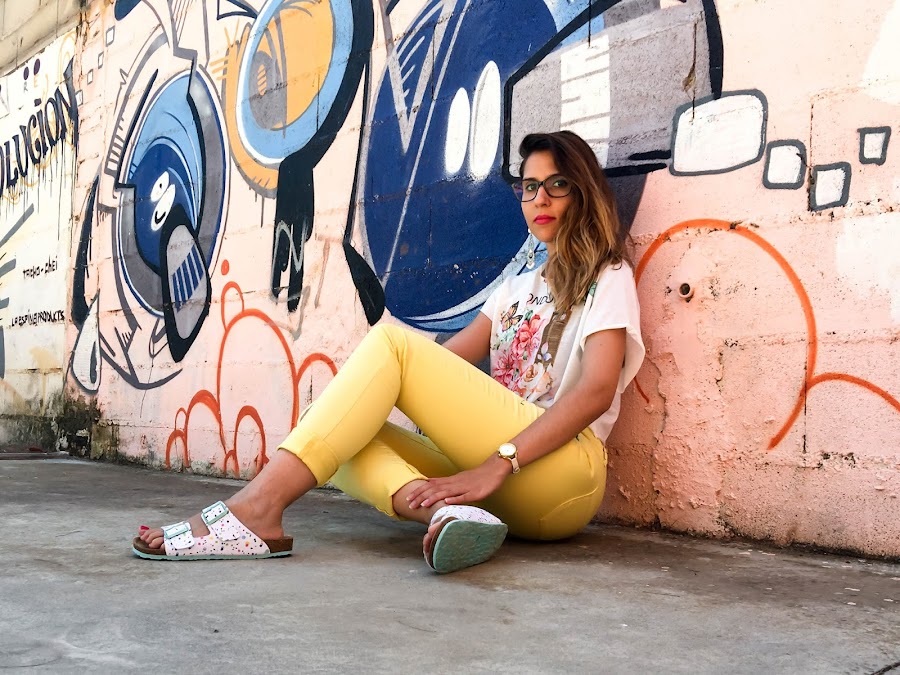 For lovers of my three DESIGUAL look, I will have thought up that I forgot the third, but no, I have not forgotten !! Forgive it up a tad later !! This third look has me in love, it is fresh, lively and colorful! Well, looks like all DESIGUAL! Hahaha. The main character of the look are some yellow jeans with a pattern of paint on the side. They are super comfortable! And to my feet, I chose white sandals with colorful polka dots that was great!