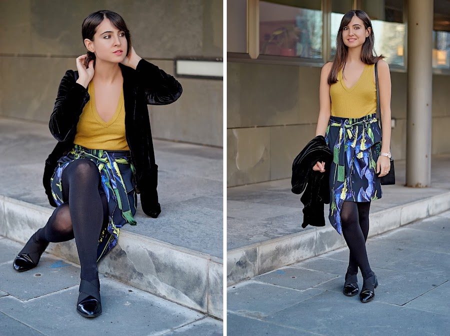 Falda y bolso: Adolfo Domínguez / Chaqueta; Bershka / Camiseta: Asos / Zapatos: Richard