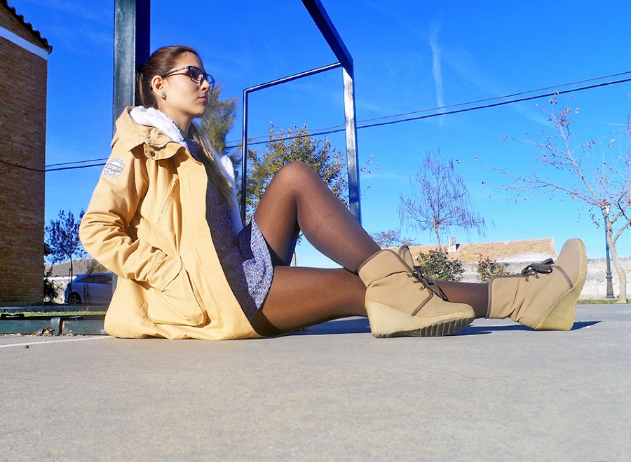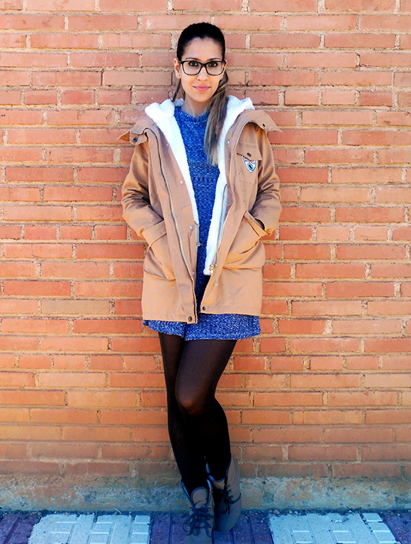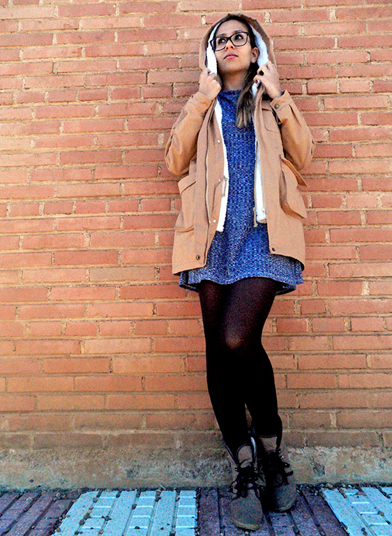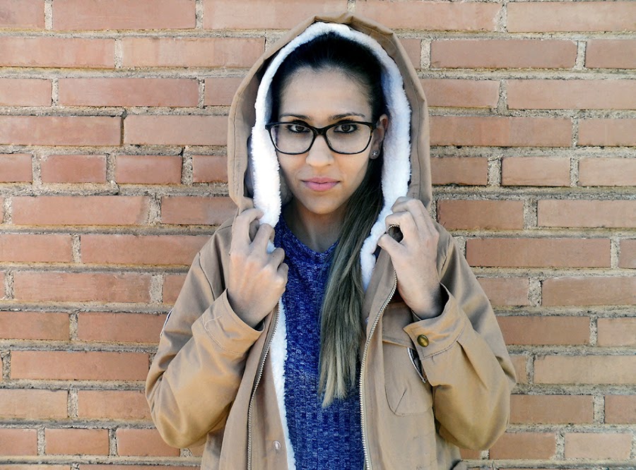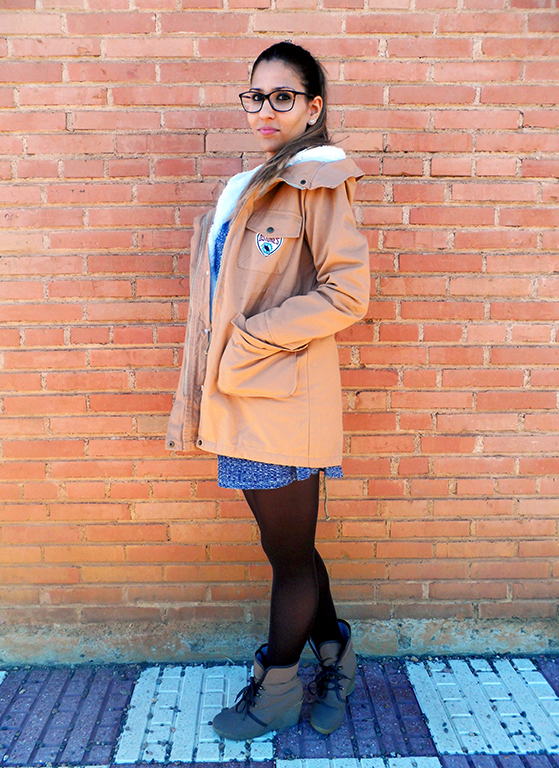Lo he combinado con un abrigo beige de dos piezas con capucha y bolsillos. Lo mejor es que lleva por dentro un chaleco de borreguito que lo puedes poner y quitar para usarlo en temporada de primavera.