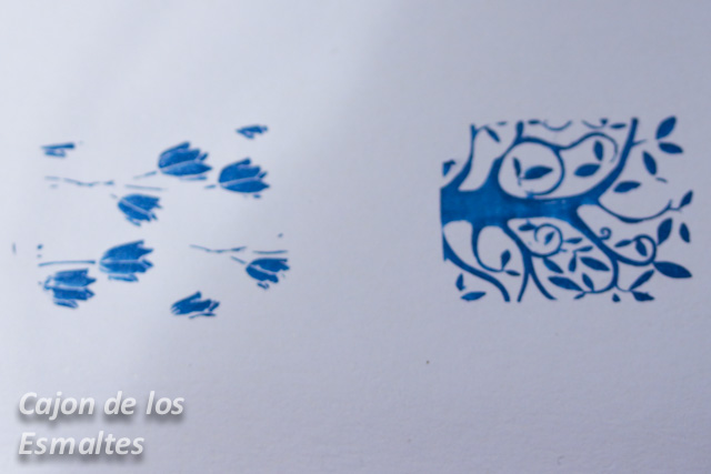 Para las pruebas usé un esmalte azul oscuro metalizado de la línea ColorShow de Maybelline (Navy Narcissist) y el sello blando de silicona XL. De todos los diseños de la placa solo tuve problemas para levantar dos dibujos, los tulipanes y el árbol de la segunda fila. Hice una segunda prueba con el sello clásico de Konad y ahí el árbol quedó bien pero las líneas finas de los tulipanes siguen sin aparecer.