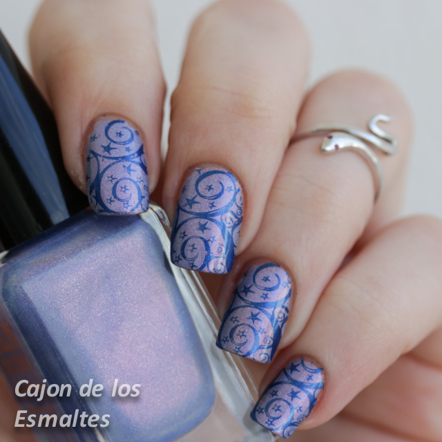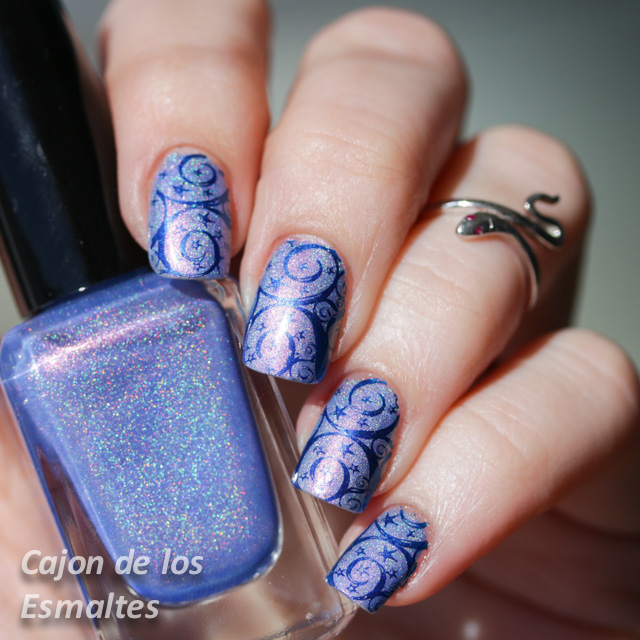 Hace unos días ya les había mostrado cuatro placas de la tienda de BornPretty Store que había comprado del primer set de 10 que sacaron. En esta ocasión les traigo otras cinco que me enviaron en forma gratuita para reseñar. Como siempre que hago pruebas de placas en papel me enamoro de algún diseño y se va directo a las uñas por encima del esmalte que tenía. En este caso fue este dibujo de garabatos y estrellas que me pareció muy mágico y apropiado para usar encima del holográfico (cuyo nombre quedará en secreto hasta otro post), no es fácil encontrar diseños que no tapen ni roben protagonismo al color de base. Para estampar utilicé el esmalte de uñas azul metalizado Maybelline Colorshow Navy Narcissist.