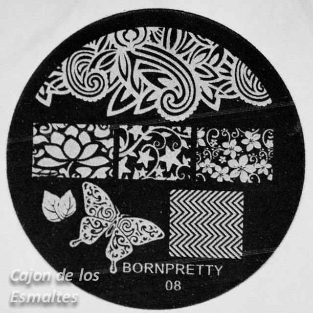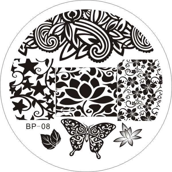 En la placa BP 08 eliminaron el diseño zigzag o chevron para agrandar los dibujos de estrellas y flores de uña entera. En esta placa la mariposa esta calada con muy poca profundidad por lo que cuesta levanta todo el detalle al menos en la versión que tengo yo.