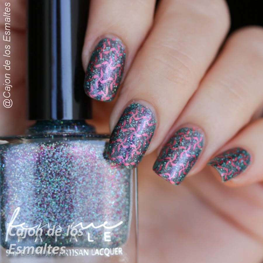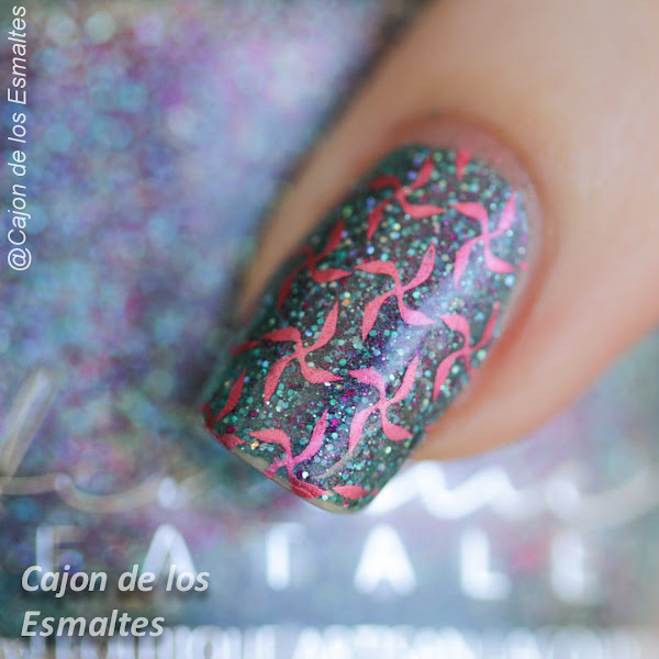 Si me acusan de haber elegido uno de los diseños menos interesante de la placa me declaro culpable, en el momento de la reseña tenía puesto a la belleza de Femme Fatale - Art of Witchcraft y busqué el diseño que lo tapara menos. El rojo del estampado iba además con shimmer / brillo del esmalte así que me pareció una buena combinación la de los molinetes. Espero que les haya gustado.