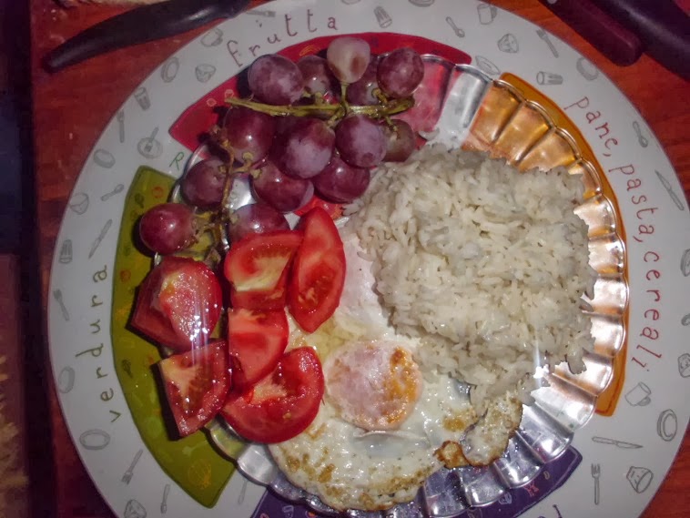 Según este plato es necesario es tomar el 25% de carne, pescado o huevos, lo que son proteinas, 25% de cereales o hidratos de carbono como son el arroz, las patatas... un 30% de verduras y para terminar el 20%de fruta, aunque haya algunas divergencias en cuanto a la cantidad de cada que hay que comer a diario. Os digo que se come bastante.