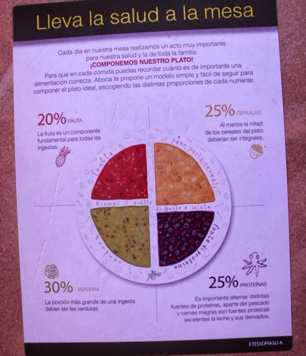 Por detrás viene bien explicado todo. Que cantidad de cada grupo de alimentos hay que consumir a diario y poniendo sobre el plato de la salud un plato transparente te haces una mejor idea.