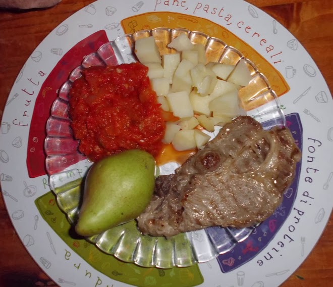Bueno, la verdad es que no tengo un peso al lado del plato para pesar mi chuleta y hacer cálculos para llenarlo, (si mis proteinas pesan 183 gr. y son el 25% del total, a cuanto ascenderán los hidratos de carbono que son el 30% del total ....), pero me ha permitido pensar en comer de todo un poco y obligarme a comer un poco más de fruta y verdura a diario, cosa que antes no hacía.