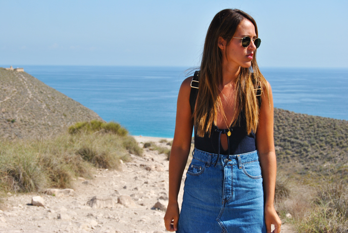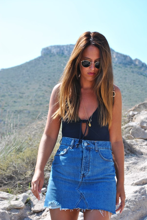 En las fotos podéis ver el look que elegí, body de punto azul con un escote en la espalda chulísimo, además fue una de las gangas de las segundas rebajas, minifalda tejana de tiro alto y mochila con tachuelas.