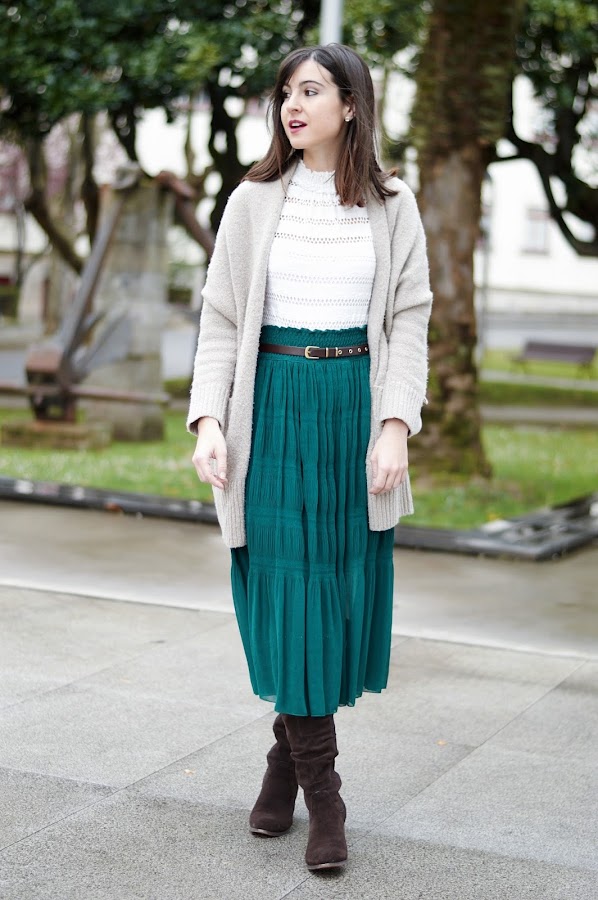 No hay nada como terminar la semana con un look lady de esos que tanto me gustan Ya sabéis que soy fan de la falda midi, y cuando tengo la oportunidad opto por llevar una de ellas y más ahora que llega la primavera Conseguir un outfit armonioso con el color verde botella no es nada difícil, en este caso recurrí a una chaquetita que ya os la enseñe en uno de mis vídeos que es de color beige para n ...