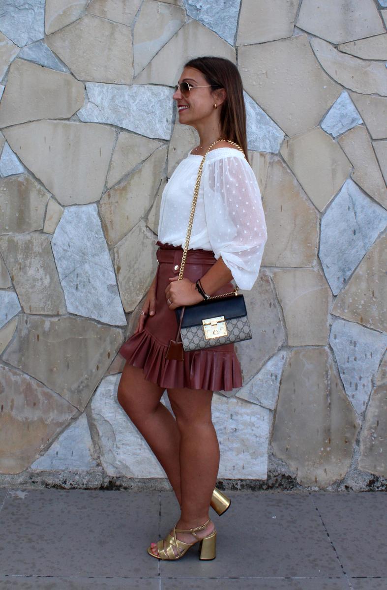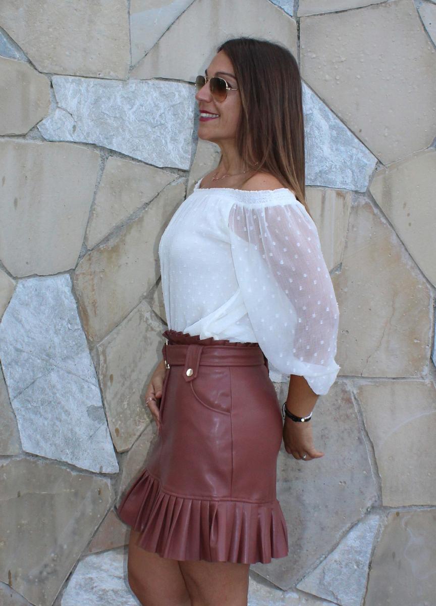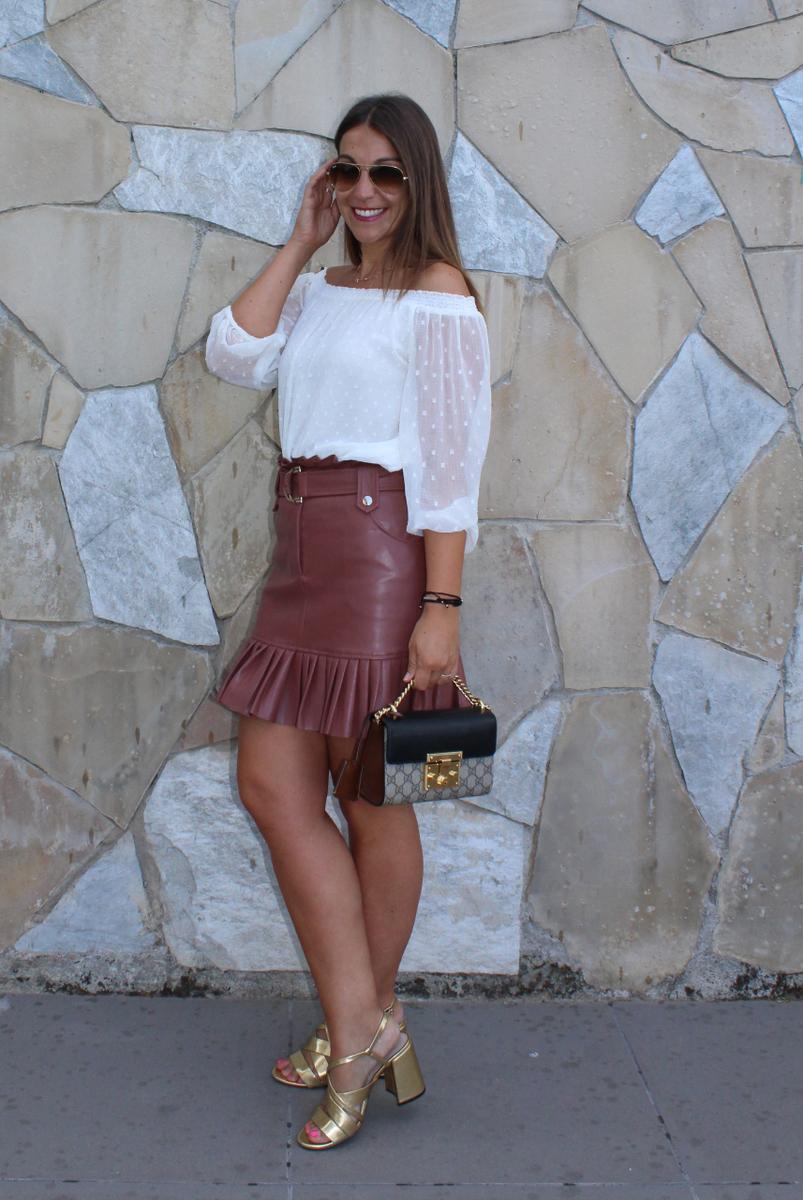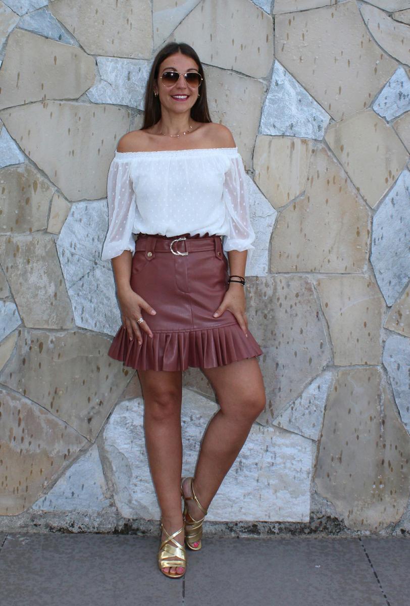 En el look de hoy he escogido una blusa de este tejido con escote bardot y manga francesa abullonada, combinada con una mini falda de polipiel con dos detalles a destacar, que creo que fueron los que causaron el flechazo, por una lado tiene cintura tipo paper bag y por otro su acabado plisado, que hacen de ésta un pieza muy muy original. Perfecta para llevar con sandalias o cuando nos adentremos más en invierno con medias y botas.