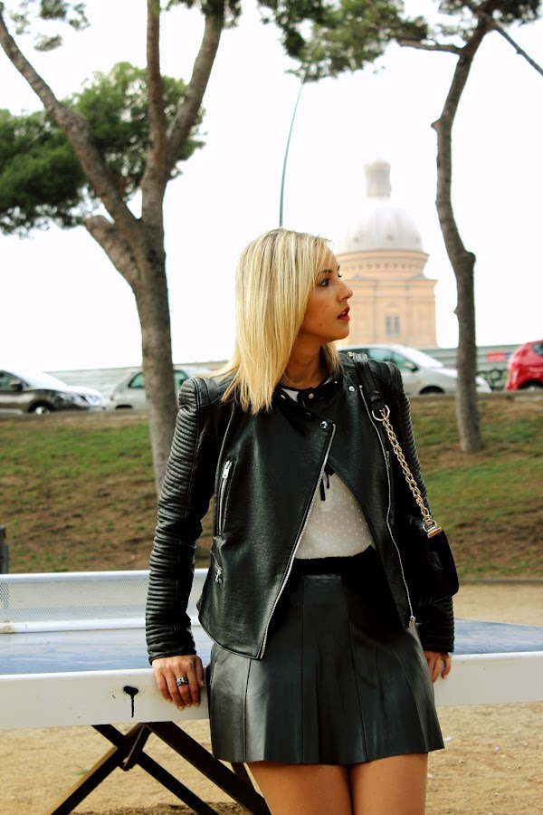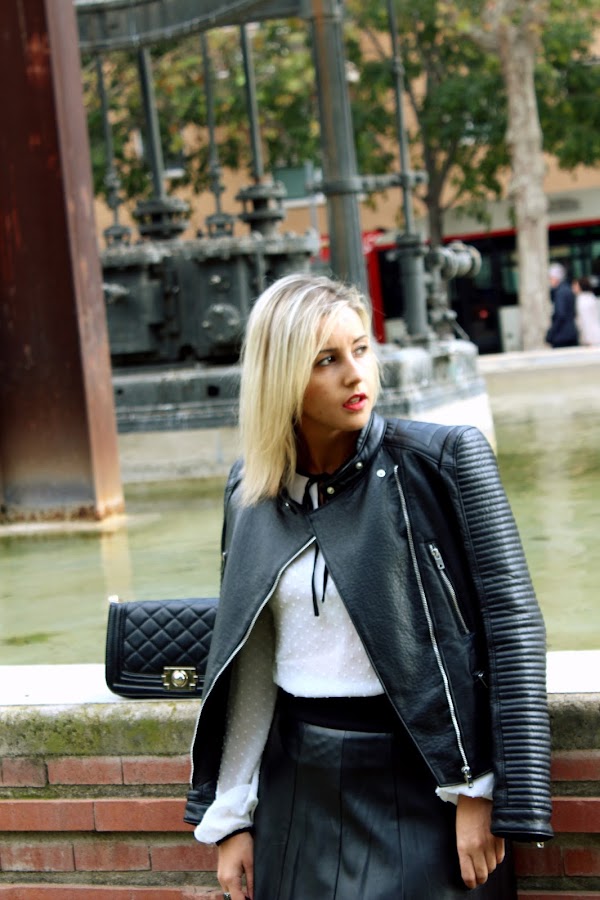 In the outfit of the day, I show you my new white shirt of plumeti with a black tie that I fell in love when I saw it. I wear it with a black leather skirt and my new leather jacket. The accessories of the outfit are my black boots over the knees and my favorite bag similar to Chanel.