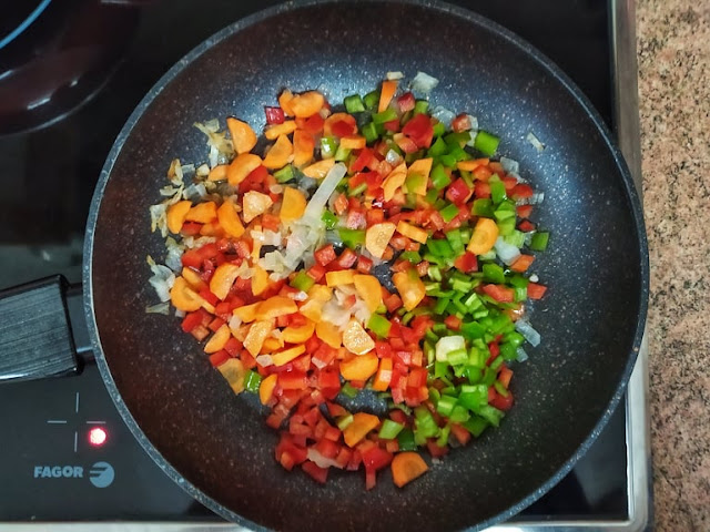 En una sartén al fuego echamos un chorrito de aceite de oliva y añadimos la cebolla en trozos muy pequeños con una pizca de sal para que poche más rápido. Lavamos, secamos, pelamos (en caso de que lo necesiten) y troceamos las verduras. Cuando la cebolla esté pochada añadimos el resto de las verduras.