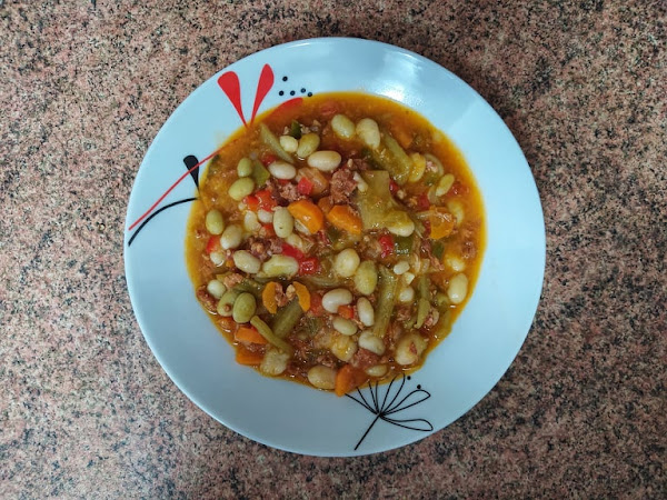 Cuando tengas nuestras pochas con verduras y picadillo de chorizo listas, servimos y a disfrutar.