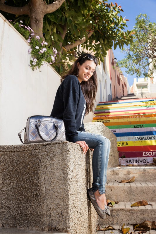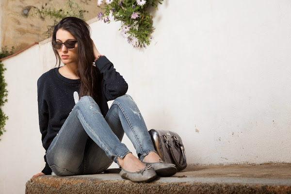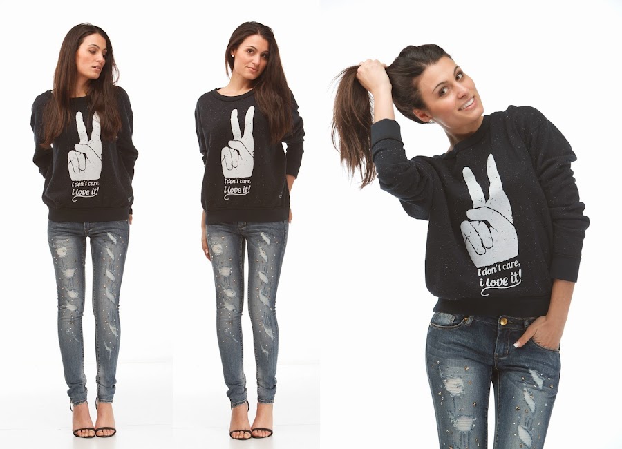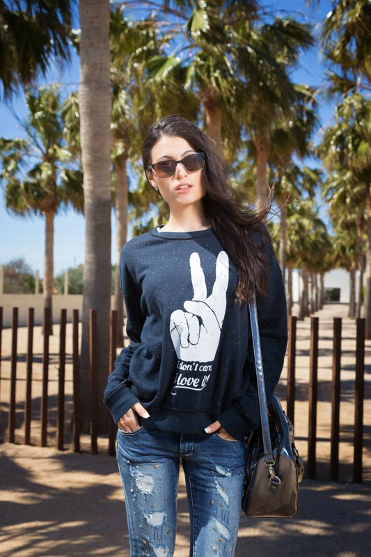 La verdad es que estoy como loca con esta sudadera "I DON"T CARE, I LOVE IT!" de DEAR TEE y estos destroyed jeans con brillantitos de SILVIAN HEACH. Me enamoré del conjuntito durante una sesión con la tienda de ropa MARTHINA y no me pude resistir...
