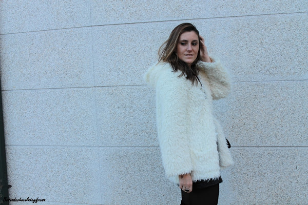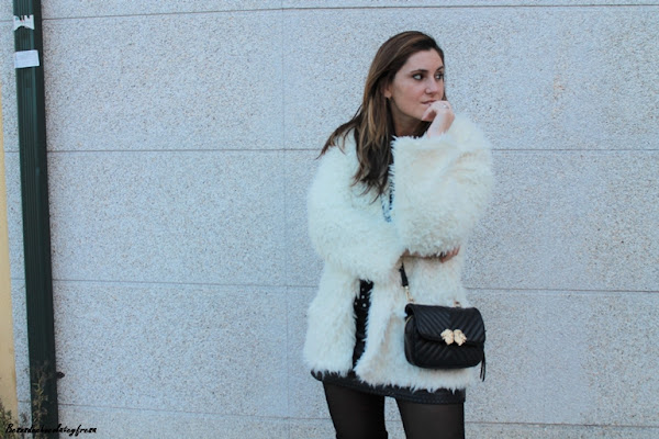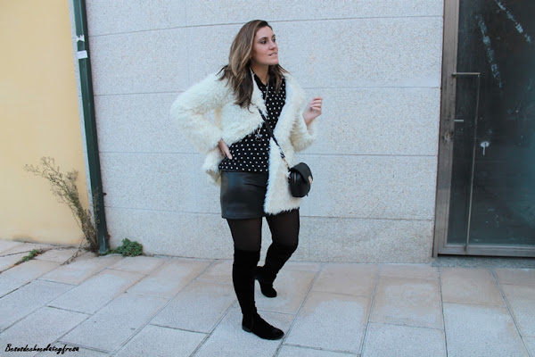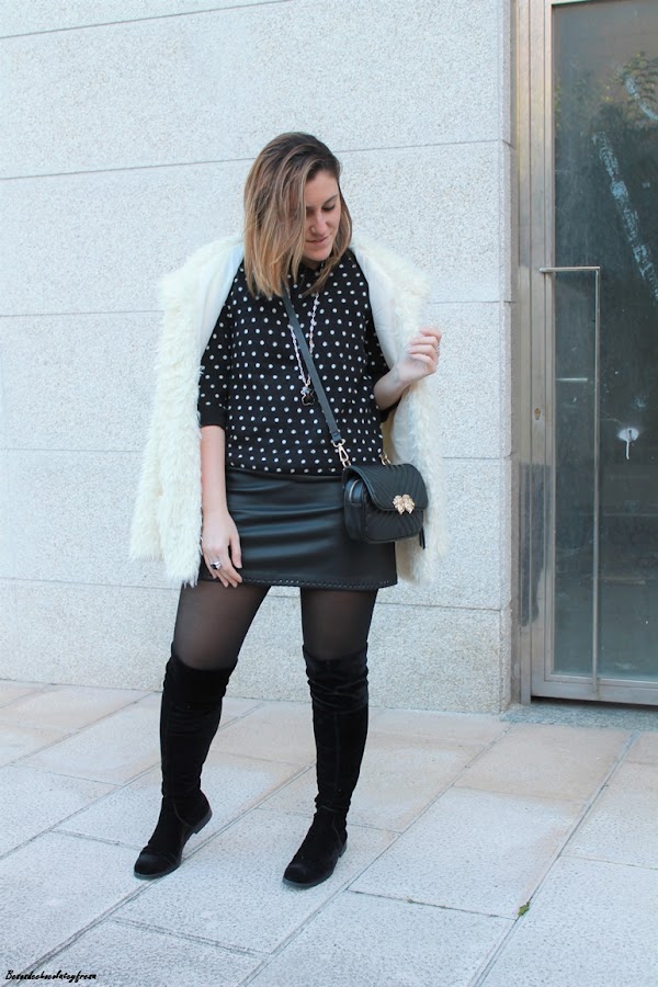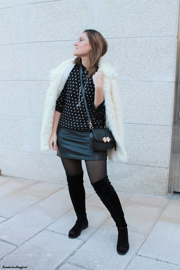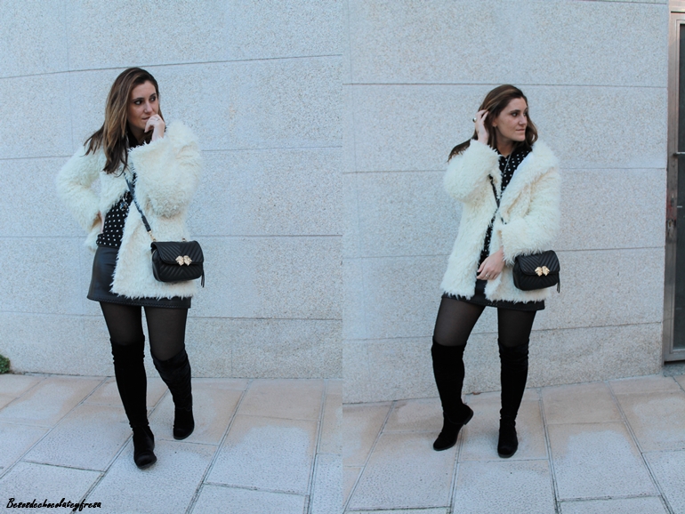 Como complementos opté por unas botas over the knee en terciopelo, bolso bandolera en negro y abrigo peluche en blanco que rompe con el monocolor en negro.