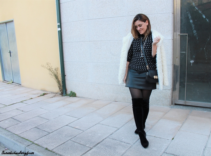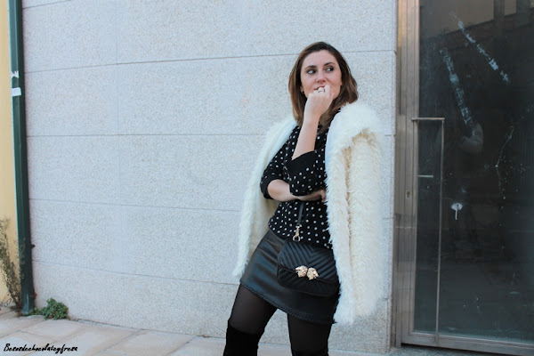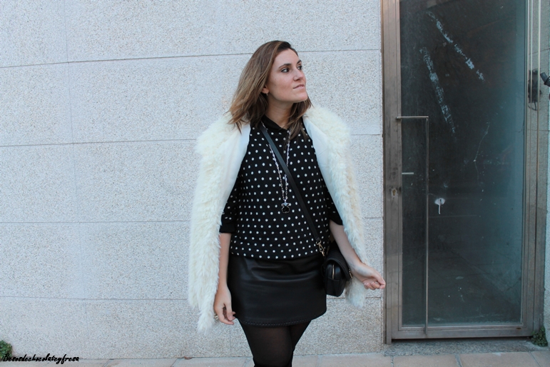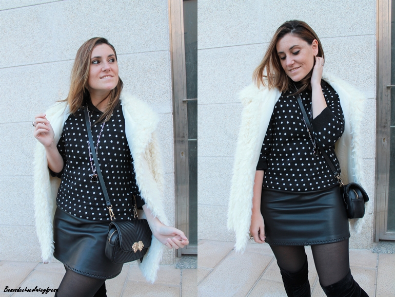 En este caso llevo todo prendas ya conocidas pero jugando con ellas a la hora de combinarlas. Aposté por un vestido de polipiel, ideal pues esta temporada se sigue llevando este tejido, junto con un sweater de lana en lunares blanco y negros.