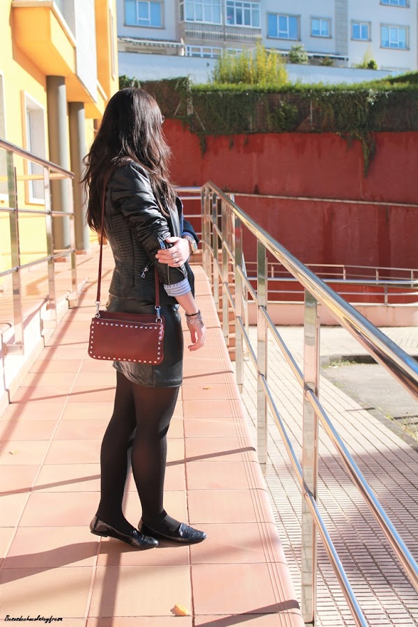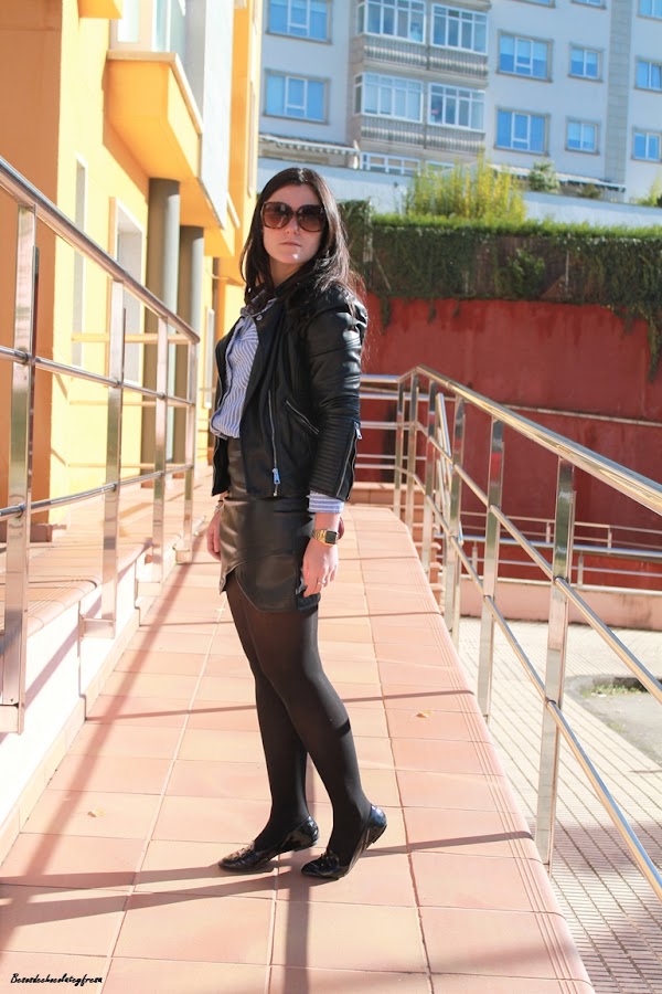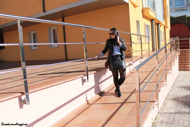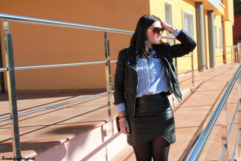 Today I bring you a look in leather, every time I like this fabric and little by little Im doing with some clothes, like this skirt crossed in black color of my store, that feels great. I combined it with light blue striped shirt, patent leather moccasins, biker and purse in burgundy to give a little contrast. What do you think?