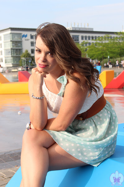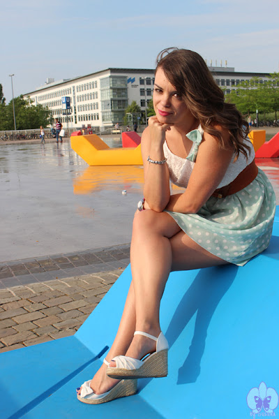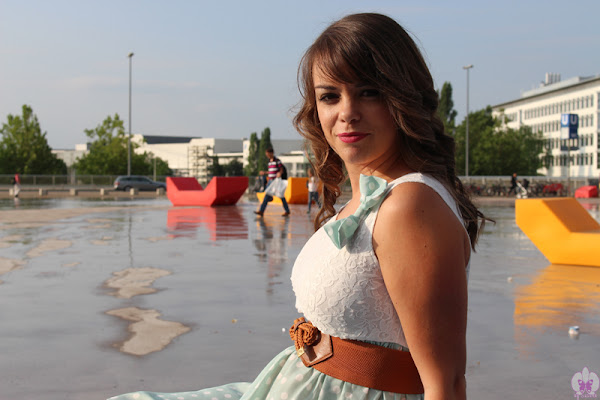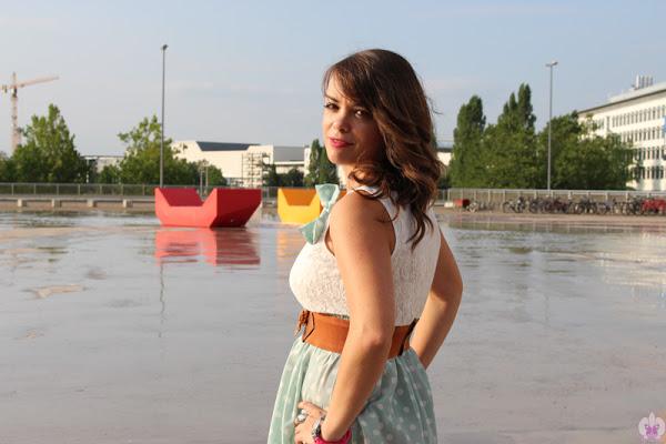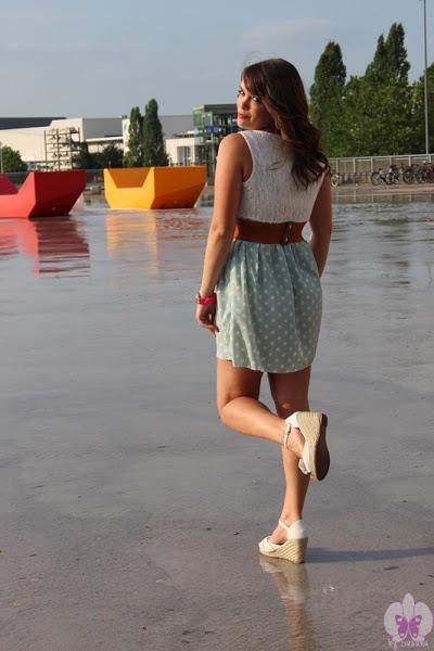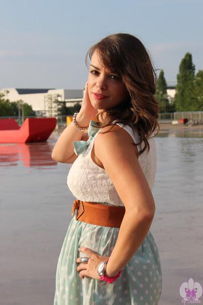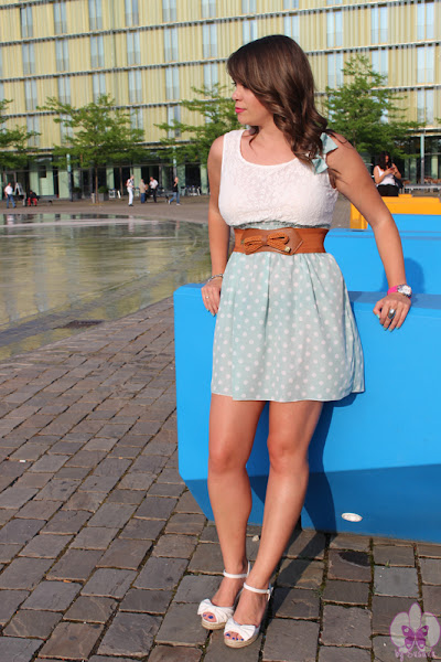 Toda la parte de arriba es de encaje blanco y lleva como toque especial un lacito en el mismo estampado de lunares blancos y fondo verde menta de la parte de abajo. Para añadirle un complemento al vestido y que fuese algo mas sofisticado, le añadí el cinturón que me venía con el vestido que os decía antes y que me parece que le favorece mucho más al vestido.