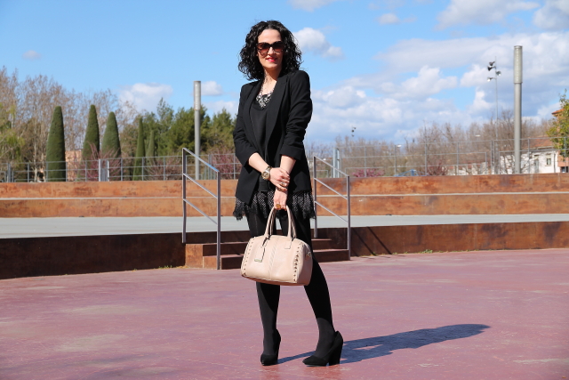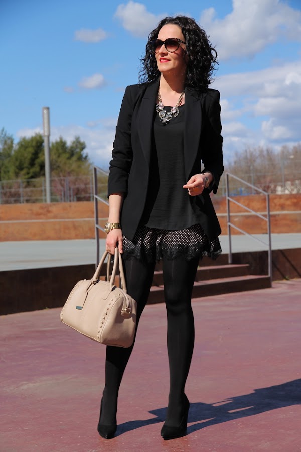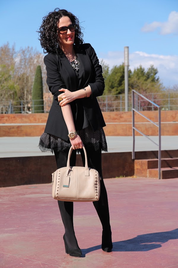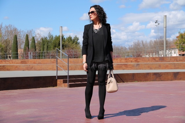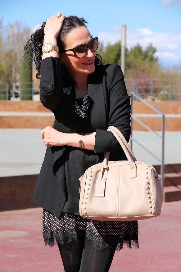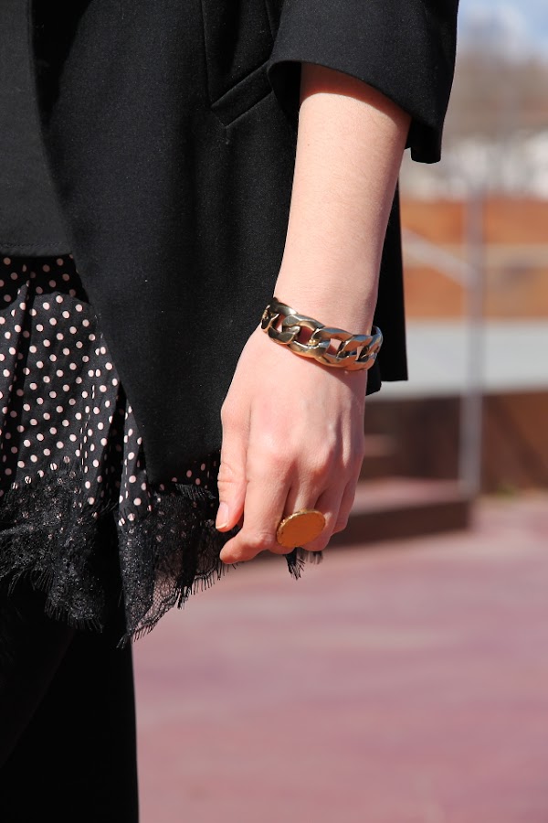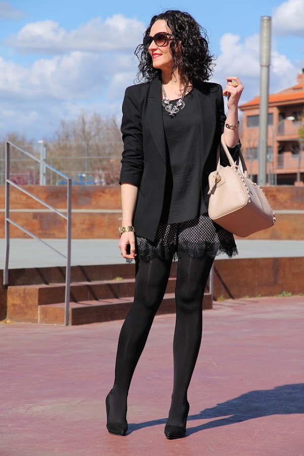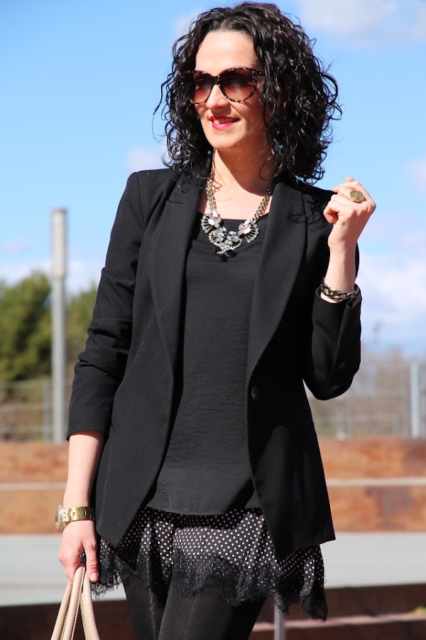Amor a primera vista es lo que sentí por estos shorts lenceros, nada más verlos ya me los podía imaginar con diferentes combinaciones. Hoy os muestro la primera con ellos, un total look negro que deja todo el protagonismo a los shorts y que resaltan con el estampado de topos nude que tienen. Es una pena que el aire no los deje ver bien, la verdad es que tienen una caída preciosa.