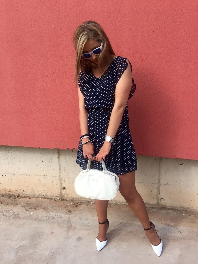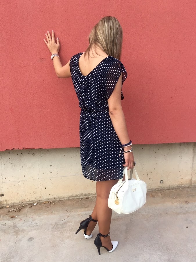 ¡Buenas noches amores! Último post de la semana, y con ganas de disfrutar del finde después de una semana de mucho trabajo. El look que os muestro hoy me encanta. En él llevo vestido de topitos blancos y azules que combine con mis stilettos en el mismo color y mi bolso blanco de Tous. Me encanta este estilo de vestidos que puedes llevar tanto para trabajar como para ir a tomar algo con tus amigos. Para mi, son un básico en cualquier armario.