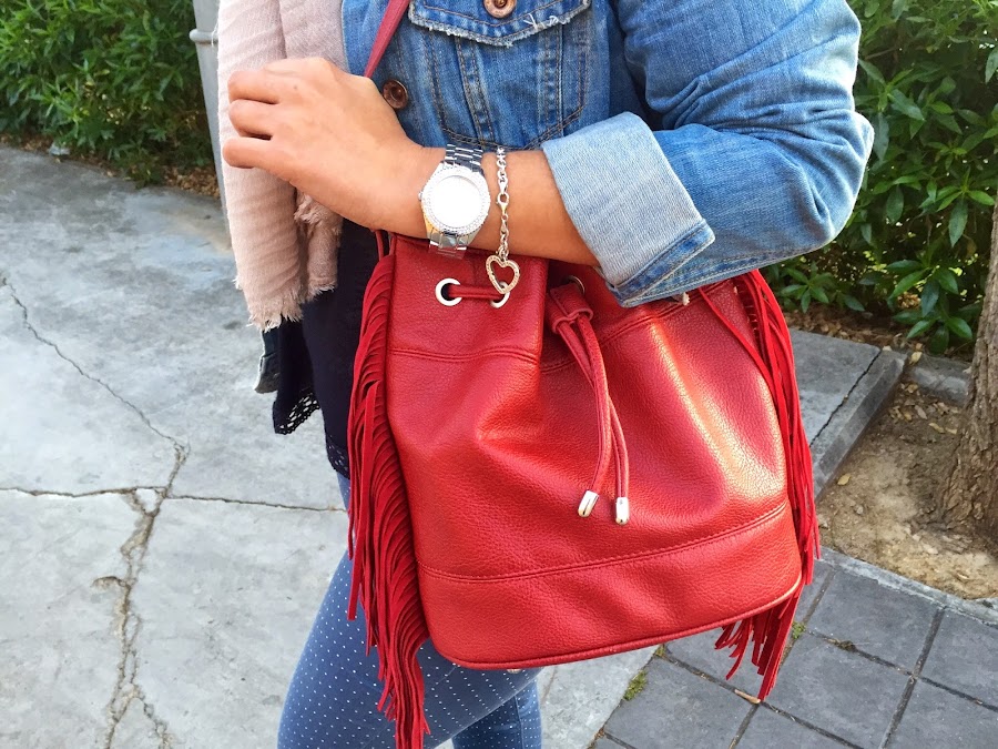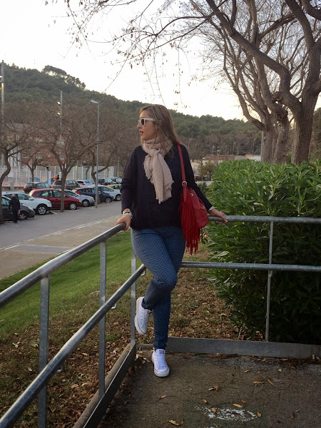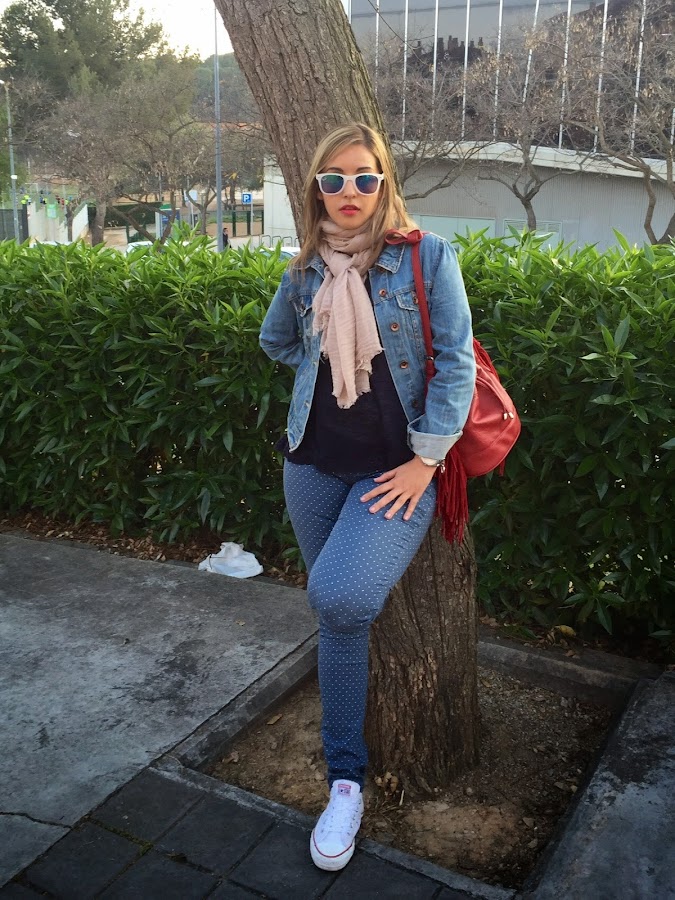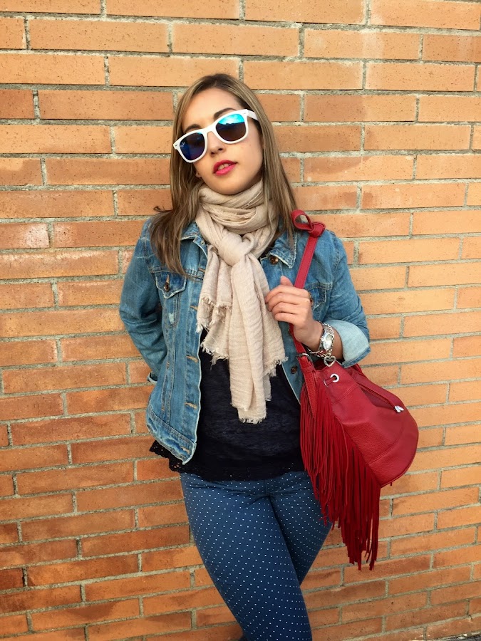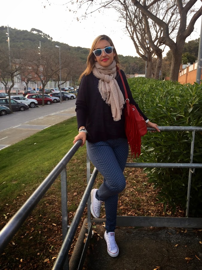 ¡Buenas noches amores! Último post de la semana con un look muy informal, ideal para ir a hacer miles de recados. Hace tiempo que quería un pantalón de topitos, y cuando vi este de Stradivarius no dude en hacerme con él. Lo combiné con un jersey azul marino, mis converse y una chaqueta tejana. Los accesorios del look, mi inseparable bolso rojo con flecos y mi nuevo fular beige.