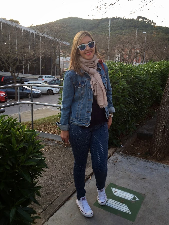 Good night loves! Last post of the week with a casual outfit that it"s perfect for these days that you have to do a lot of things. I always wanted polka dots trousers and when I saw these, I bought them. In the outfit of the day, I wore it with a blue sweater, my converse and a denim jacket. The accessories were my red bag with fringes and my new beige foulard.
