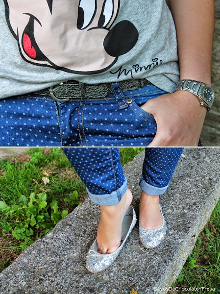 Para esta ocasión llevo mis nuevos jeans de topos con camiseta de Minnie Mouse en gris y detalles en rojo, como también lo llevo en el clutch y la pulsera de libélula de La Pulserería, y en los pies bailarinas de brillos para darle un toque chic.