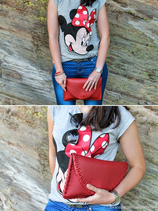 For this occasion wearing my new jeans moles in tank Minnie Mouse in gray and red accents, as well as what I wear on the clutch and bracelet dragonfly The Pulserería, and feet dancers brightness to give a chic touch.