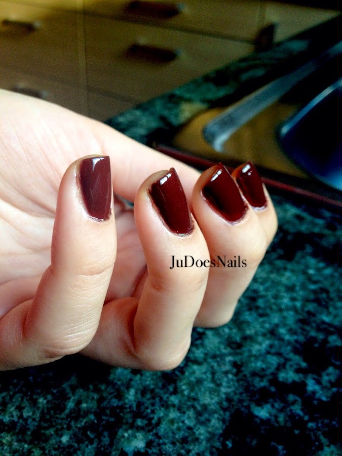 Con una capa aún se podía apreciar un poco las uñas, pero te tendrías que fijar mucho ya que casi cubre a la perfección. Para un mayor resultado he aplicado dos capas. Se trata de un marrón chocolate oscuro muy invernal.