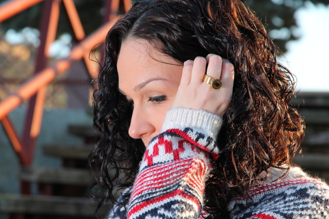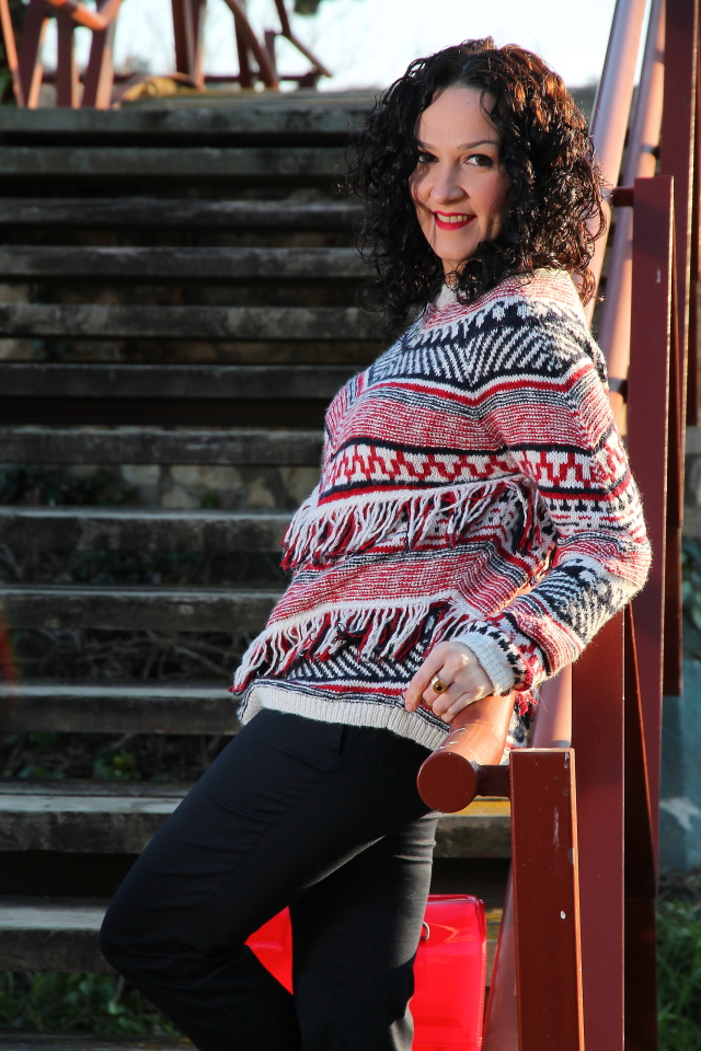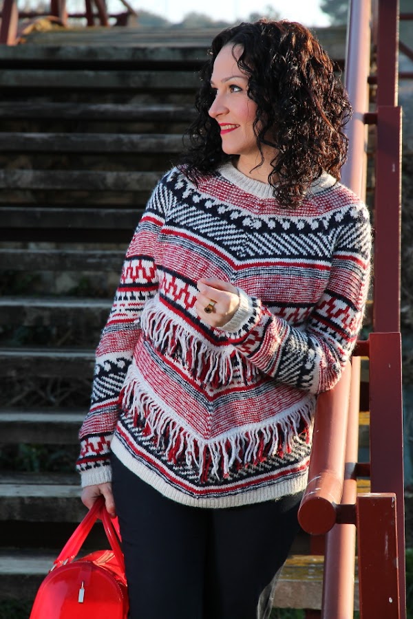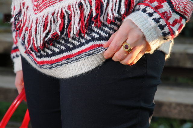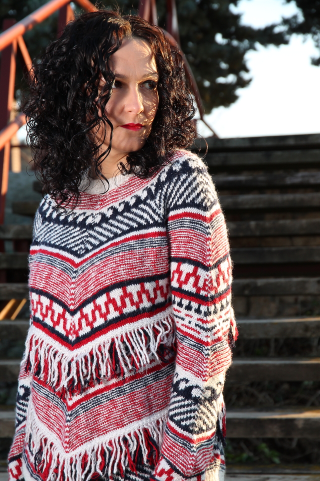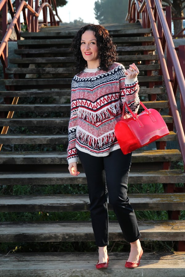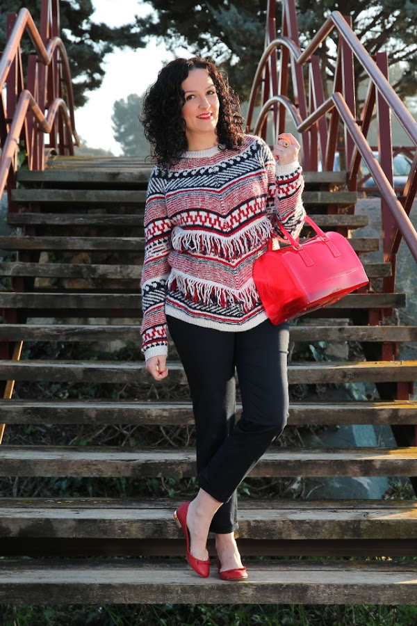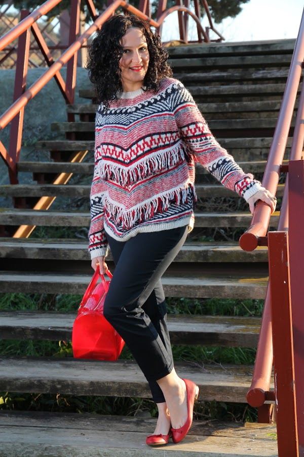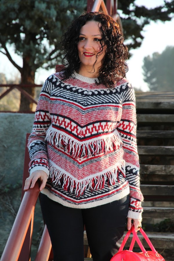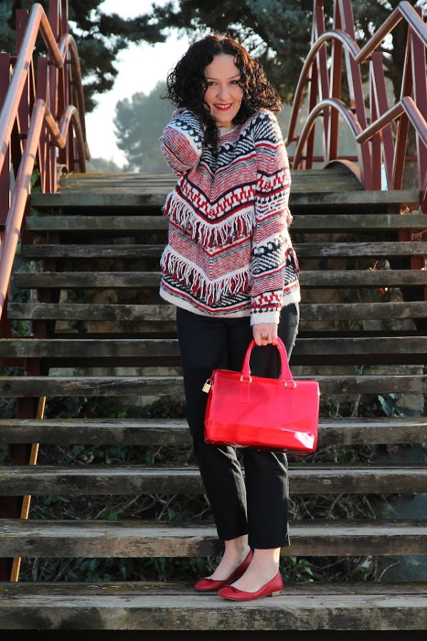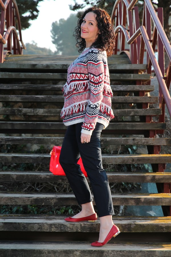 Tengo suerte de que me gusten los jersey de punto porque con lo friolera que soy en invierno es que no me los quito. Hace unos días, en mis redes sociales os enseñé este look que lo lleve para un día de trabajo y os encantó. El jersey estilo poncho es otro de mis regalos de estas navidades gracias a mi mami. Es súper original y favorecedor, además combinado simplemente con unos pantalones capri azul marino y bailarinas rojas queda genial.