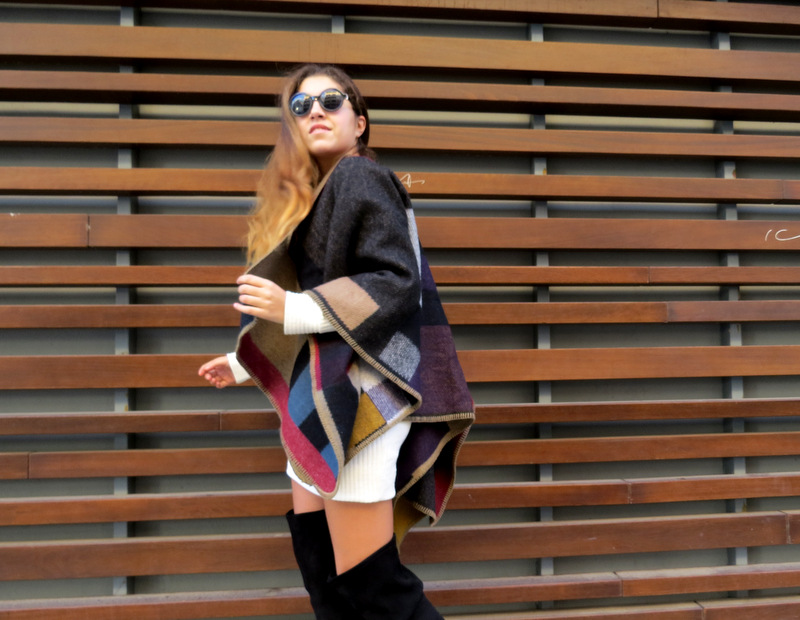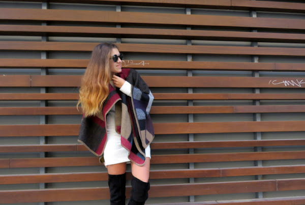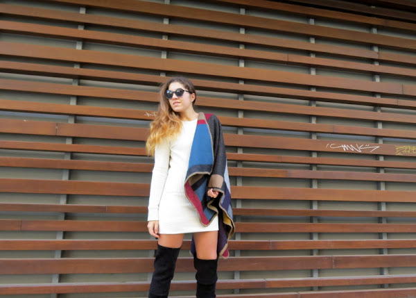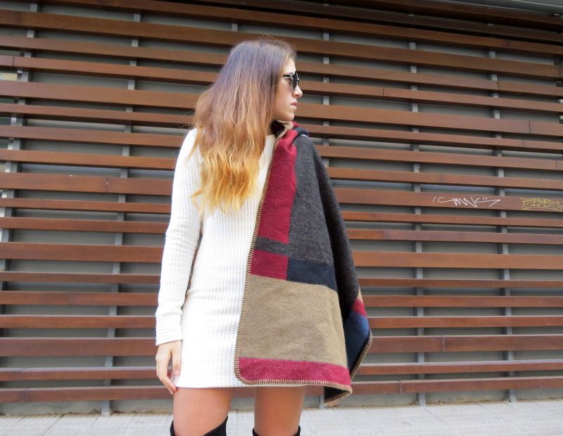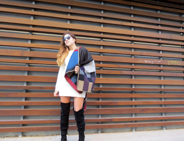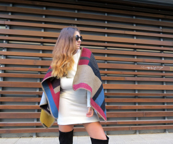 Pues para combinar este poncho he elegido prendas muy básicas de mi fondo de armario. Un vestido básico en tono hueso y las botas hasta la rodilla.