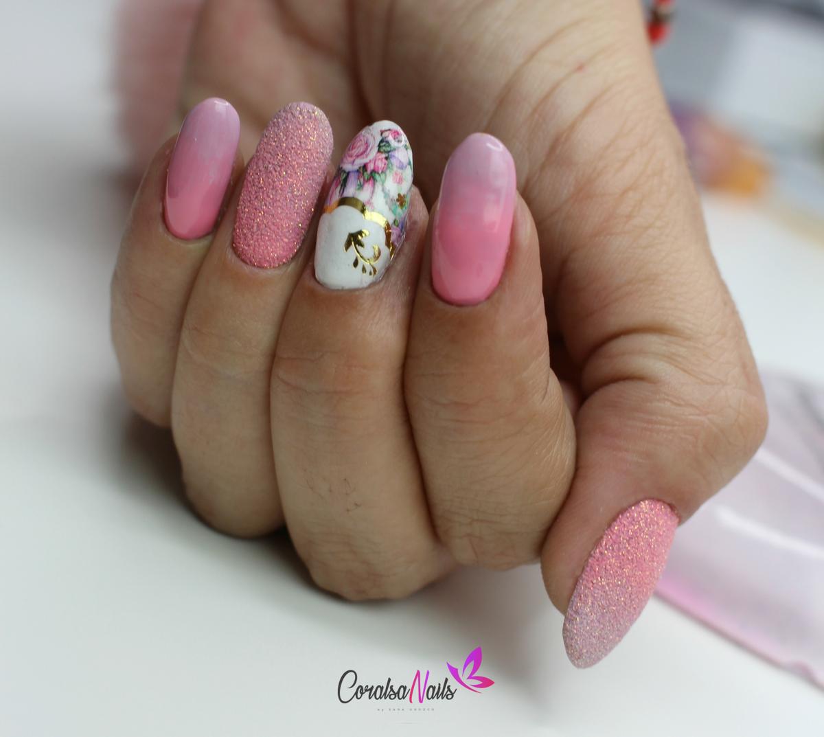 – Para las uñas que he elegido hacer efecto azúcar hay que aplicar la purpurina por encima antes de curar en lámpara (muy importante)