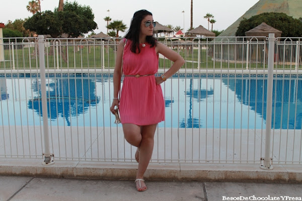 For the second day I opted for the pink, wearing this dress with pleated waist to mark gold sandals gold and white spikes and white bag belt.