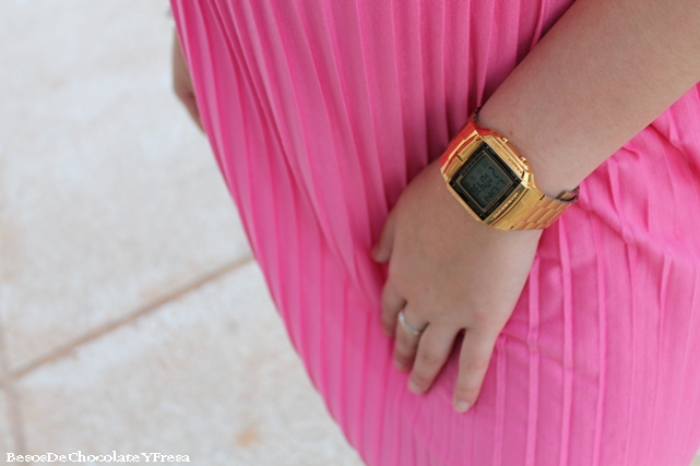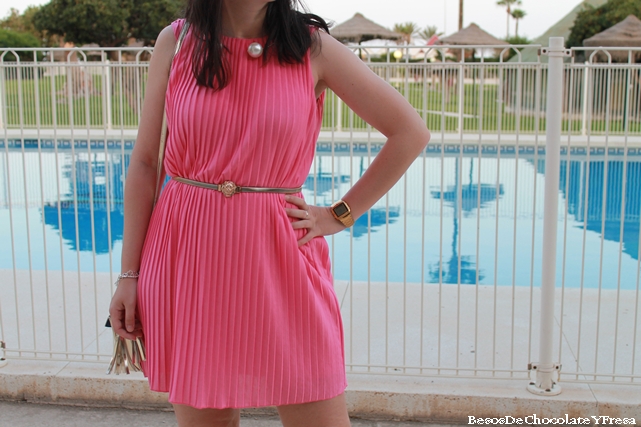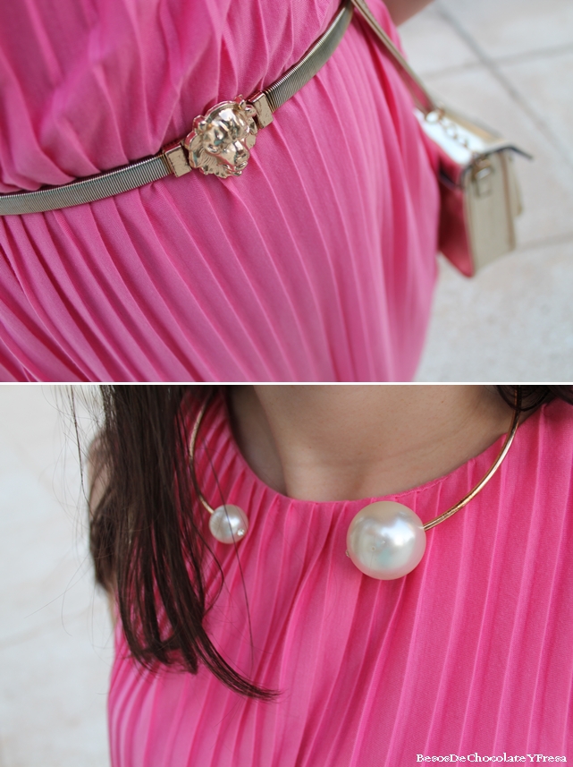 Para esta segunda jornada opté por el rosa, llevando este vestido plisado con cinturón dorado para marcar cintura, sandalias de pinchos doradas y blancas y bolso blanco.