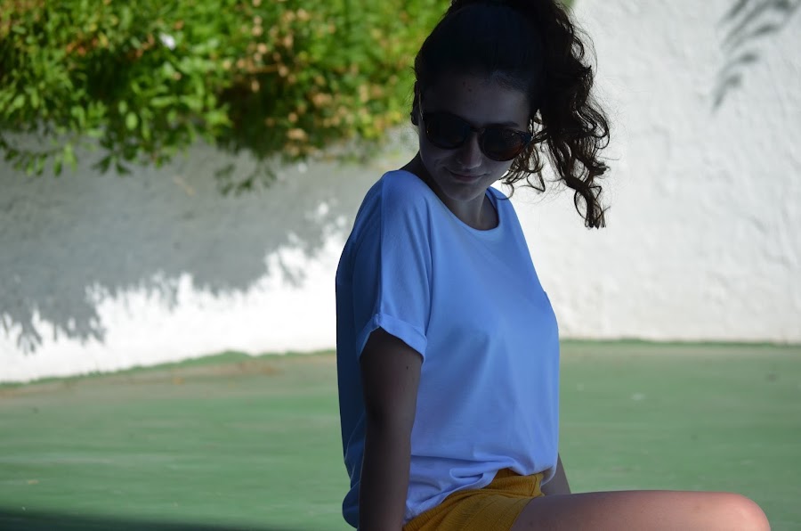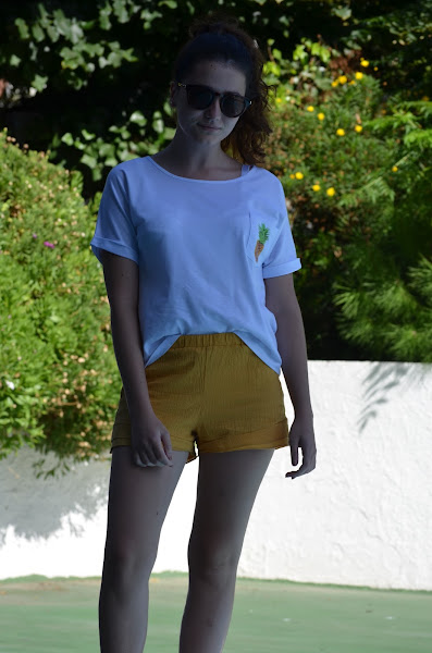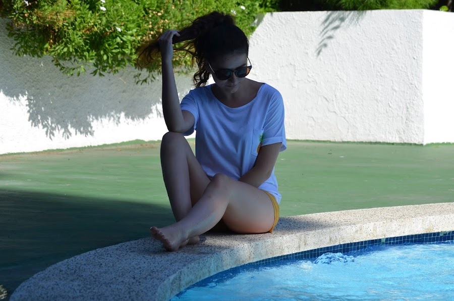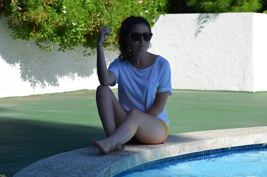 Hoy os dejo con estas fotos de una tarde tranquila en la piscina durante nuestras vacaciones. Escogí estos shorts en color mostaza de SheIn que podéis comprar haciendo click aquí combinados con camiseta básica blanca con el detalle de la piña. ¿Qué os parece? Espero que os guste.