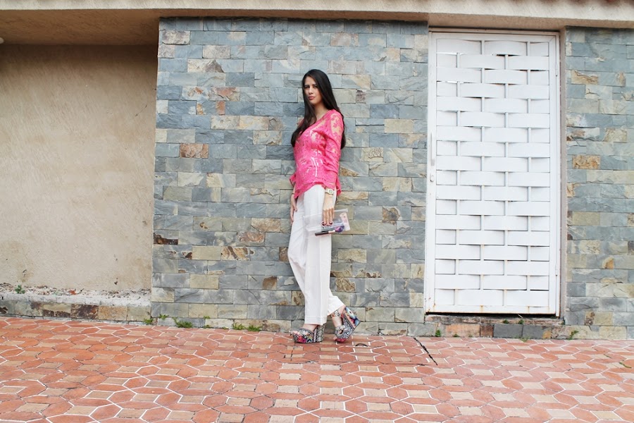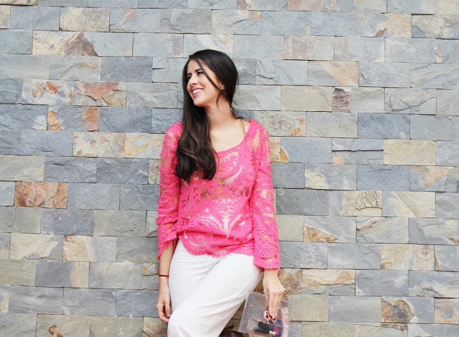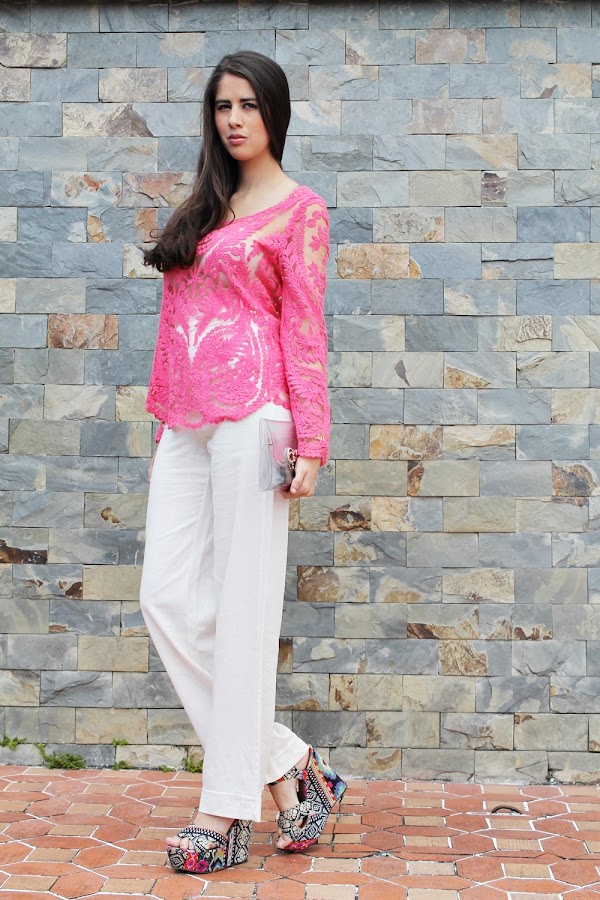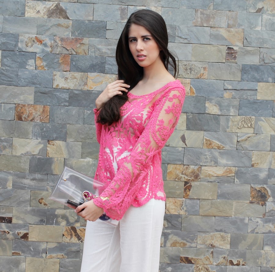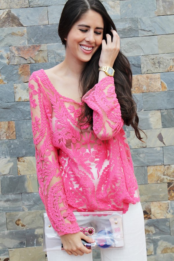 Este look es el último que tomamos para el especial #MesRosa de verdad me encanto mostrarles como usar este lindo color que simboliza la lucha contra el cáncer de mama durante todo un mes, es un look simple y delicado. Decidí utilizar esta camisa con transparencias pero para no mostrar más de lo necesario la combine con este pantalón de lino color blanco que tiene talle alto, un clutch transparente y unas plataformas de varios colores para dar ese giro inesperado.