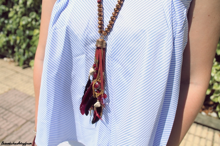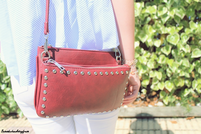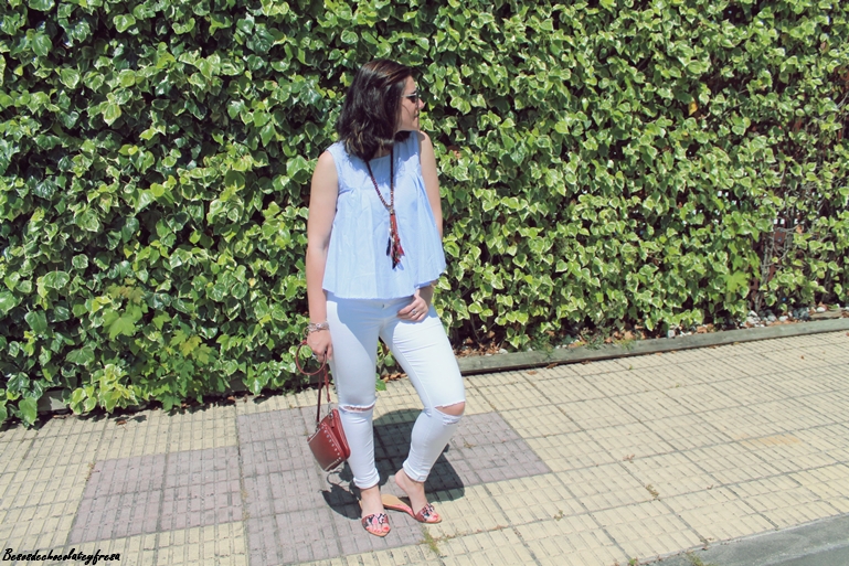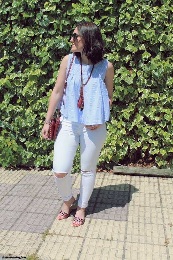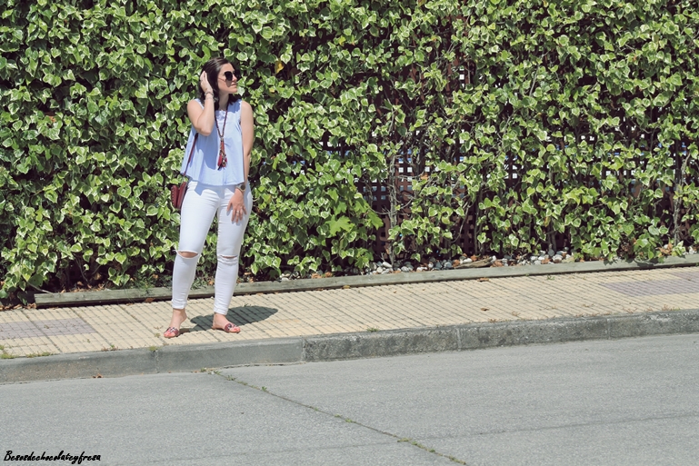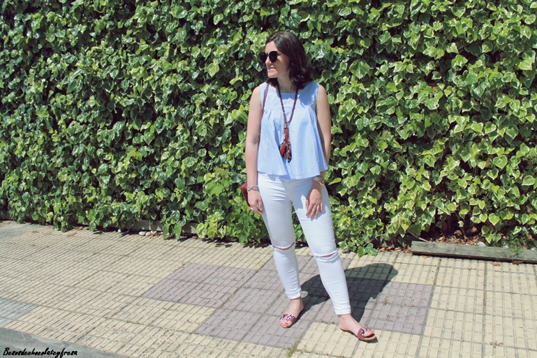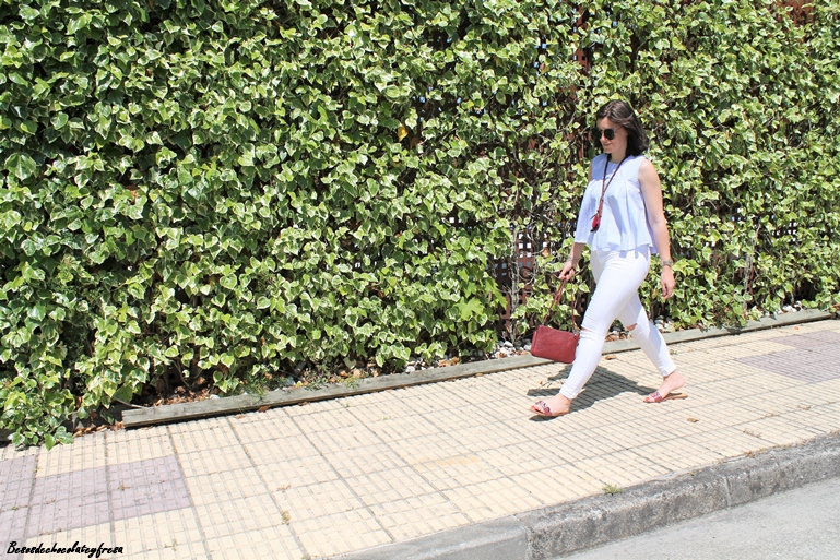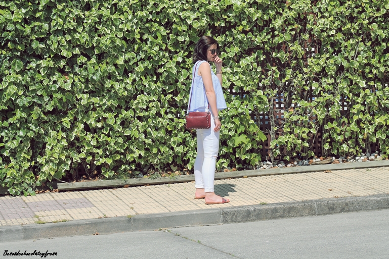 Con mi nueva blusa popelín en celeste y con vuelo de manga de sisas, la acompañé de unos jeans blancos con rotos y complementos en burdeos como es el bolso de tachuelas, el maxi-collar y sandalias "palas" en los pies que vuelven de nuevo a ser tendencia después de unos años.