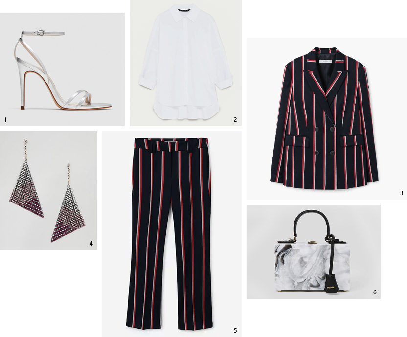 En orden numérico: Sandalias plateadas, Zara. Camisa blanca oversize, Zara. Americana de rayas, Mango. Pendientes en degradé, ASOS Design. Pantalón de rayas, Mango. Bolso con efecto mármol, Uterqüe.