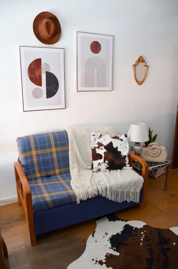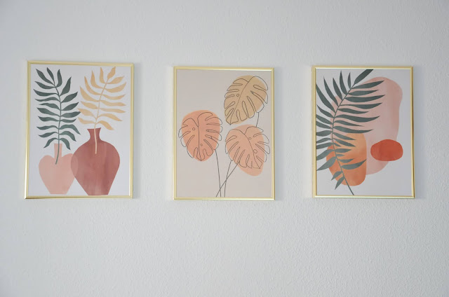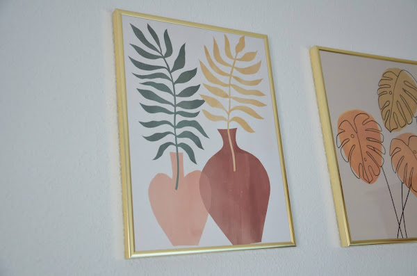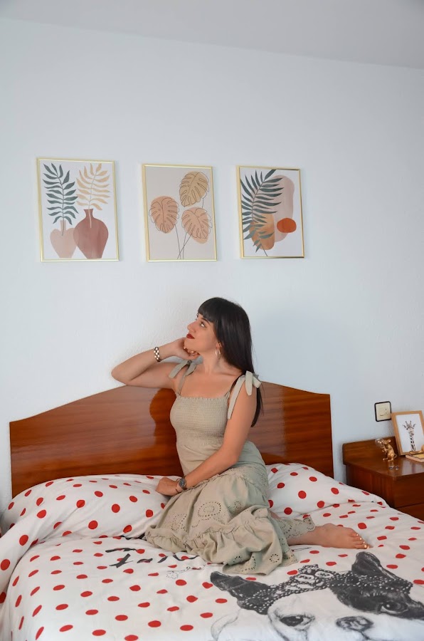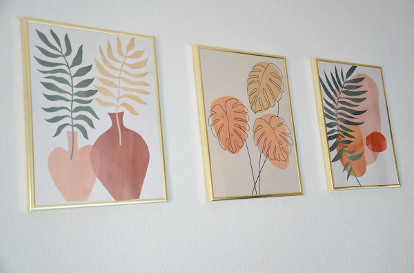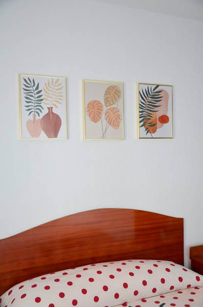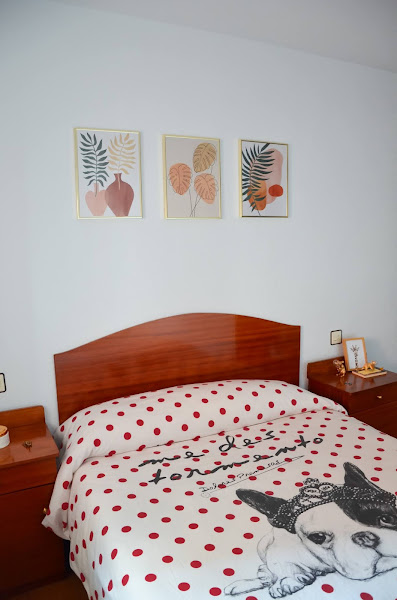 En mi habitación, me decanté por una colección de tres pósters de arte abstracto de hojas y ramas. Combinan tonos marrones, verdes y naranjas que dan una apariencia muy armoniosa a la estancia. Además, tengo pensado ampliar este mural con otros pósters de este estilo que ya he visto en la web y me encantan
