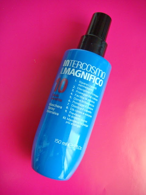 Es una mascarilla intensiva en spray de la firma italiana Intercosmo, que ofrece diez beneficios, y es del estilo del Uniq 1 de Revlon, aunque el olor de ésta última me gusta más, teniendo en cuenta que las dos huelen de lujo. Repara el cabello dañado, protege el color y del calor, previene las puntas abiertas, facilita el desenredado y disciplina el cabello crespo. Contiene 150ml y lo compré en mi peluquería por unos 14?.