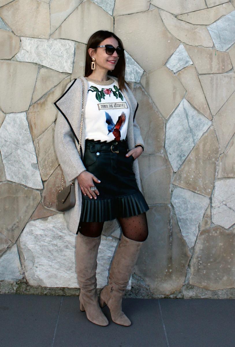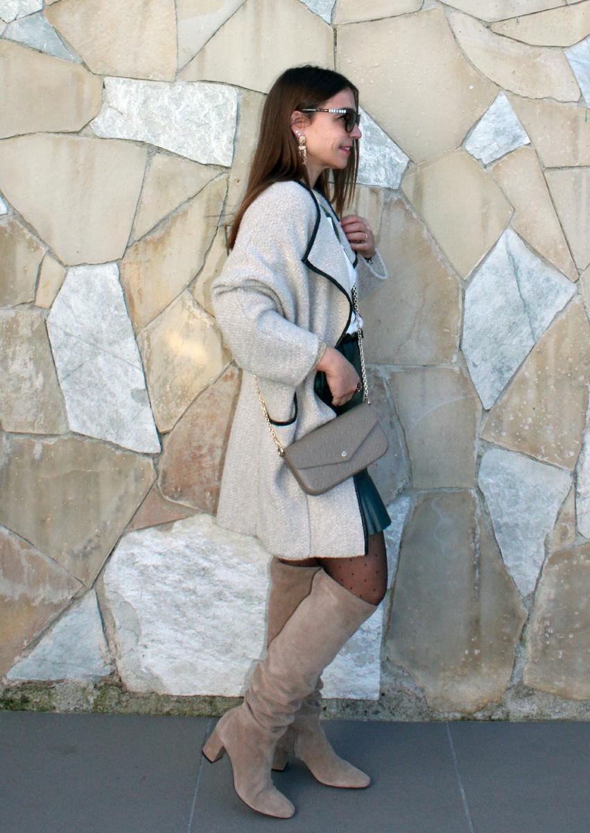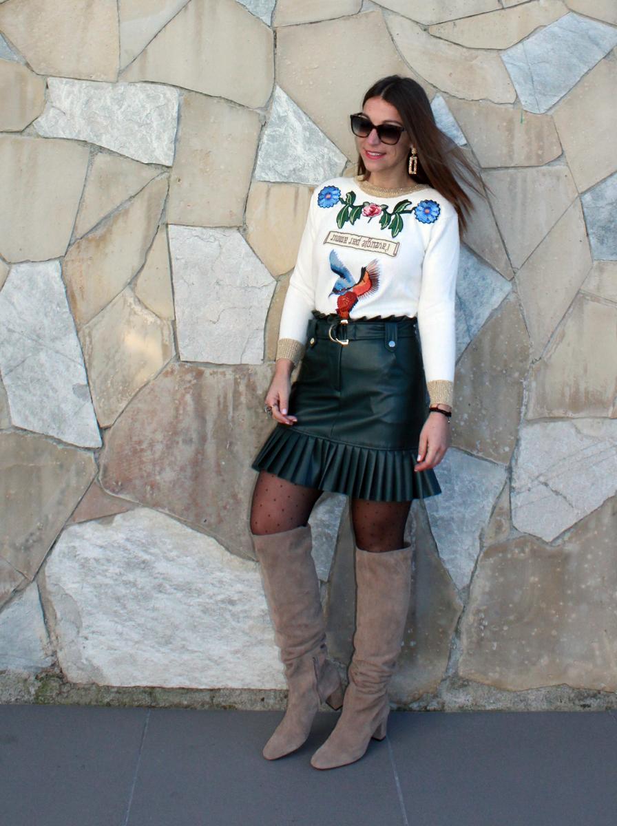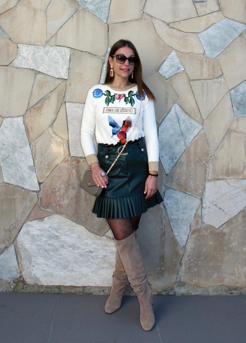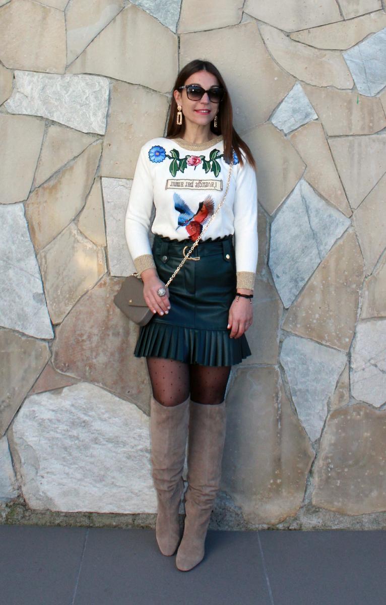 El outfit, por lo tanto, se compone de la falda en color verde musgo combinado con jersey de cachemir con motivos naturales y animales, y botas overknee. Como el frío nos ha dado una tregua y estos días parecen más primaverales que invernales, una chaqueta de lana con grandes solapas y grandes bolsillos.
