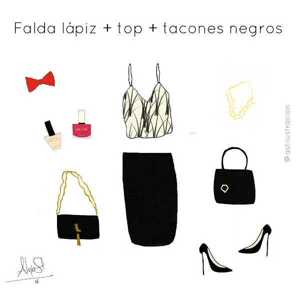 3. Falda lápiz + top + tacones negros.