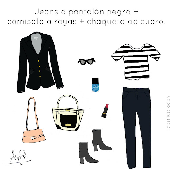 Como protagonistas tenemos tres prendas básicas como lo son: jeans o pantalón negro (de acuerdo a tu estilo y a la ocasión) camiseta a rayas, y chaqueta de cuero (o solo negra).