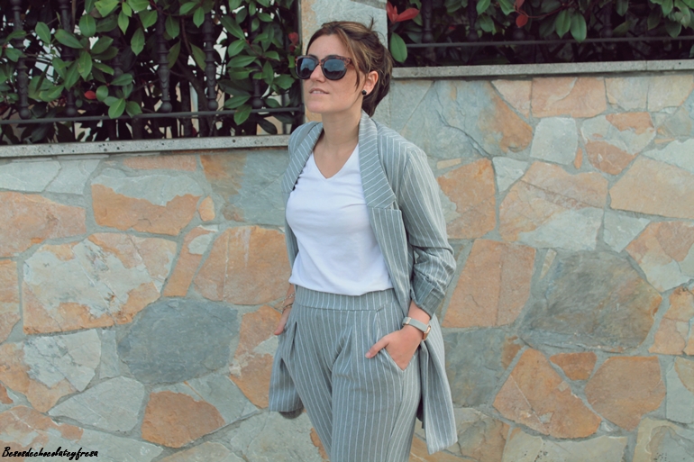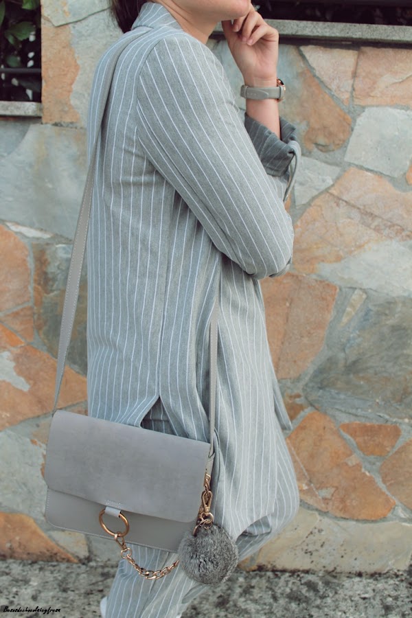 Un traje dos piezas compuesto por blazer oversize abierta sin botones y pantalones tipo carrot (de los que ya os hable hace unos días en otro post del blog, aquí) ambos con un color muy socorrido ahora para el otoño, en gris clarito y el detalle de la rayas verticales en blanco.