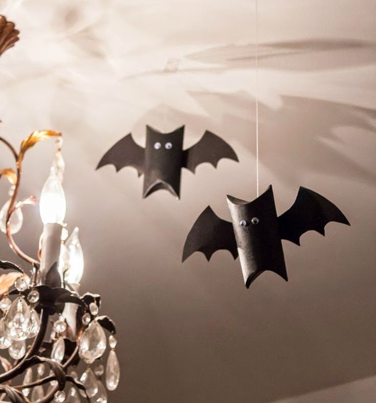 Necesitaríamos: Rollo de papel higiénico vacío, pintura negra, cartulina negra, ojos adhesivos, hilo de sedal y celo para pegar el hilo al techo.