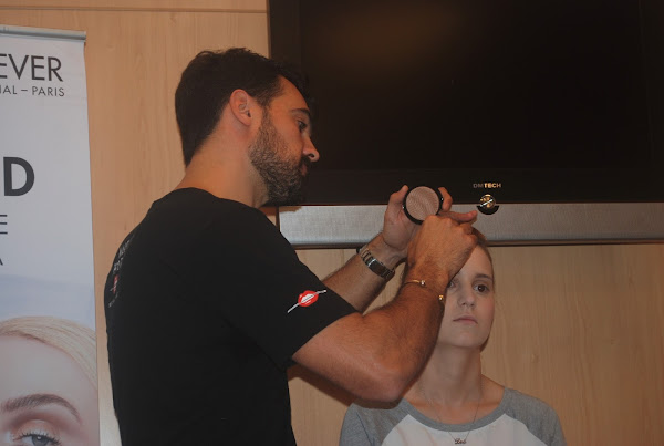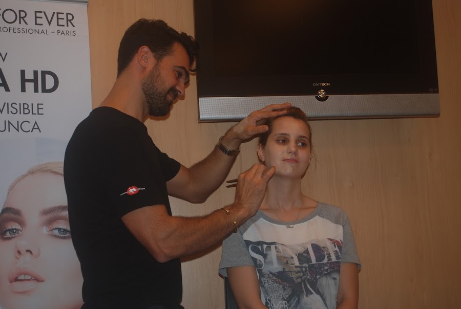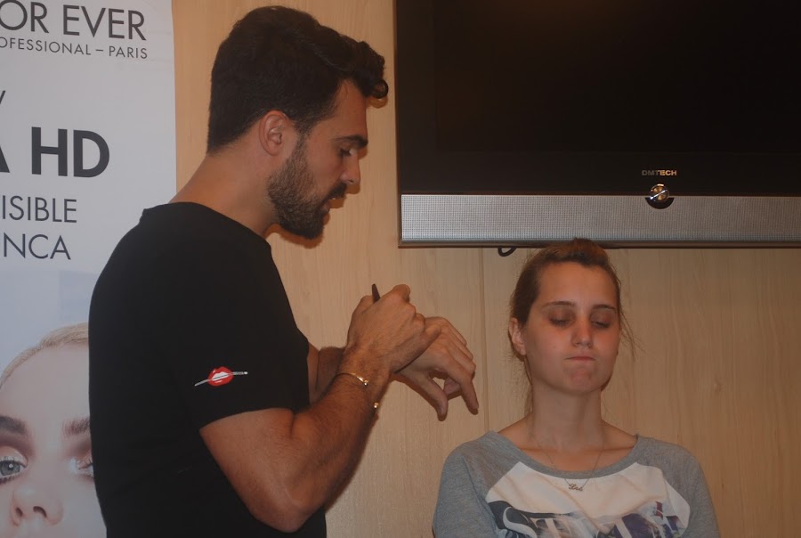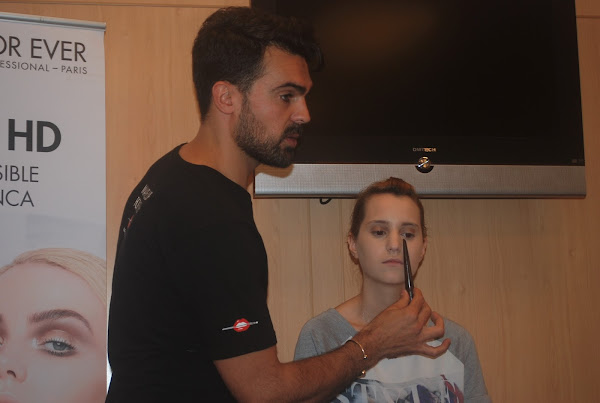 Los primeros pasos para realizar el maquillaje fueron: aplicar primers y prebases (una o varios dependiendo de la necesidad de cada persona), corregir imperfecciones y aplicar una base de nuestro tono de piel. La base que el utilizó fue la Ultra HD. Tengo una muestra que me dieron ese día, así que ya os contaré que tal porque aún no la he probado.