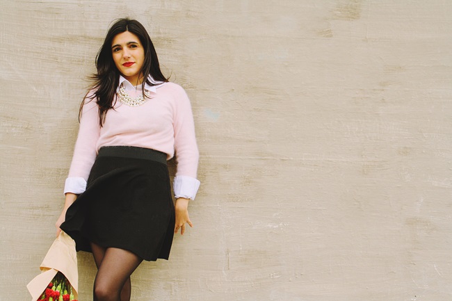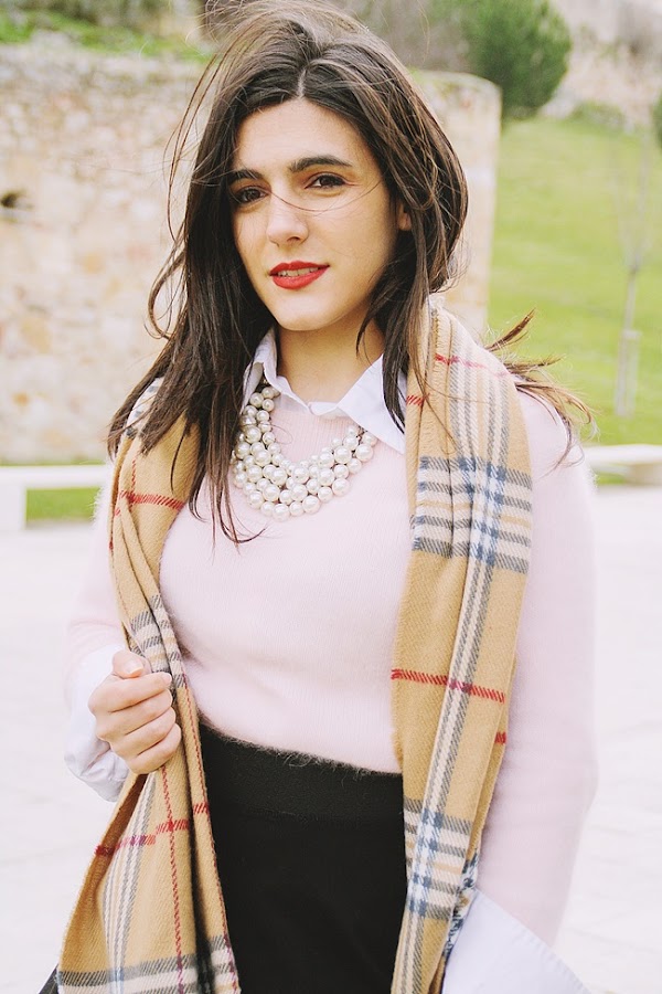 Lo combiné con una falda negra que suelo ponerme bastante porque, no sé por qué, tenia claro que quería ponerme falda. Los botines negros me los puse para... ¿sinceramente? no pasar frío. Sí, los stilettos son ideales pero vivo en Salamanca y hay que ser realistas. Rompen un poco la estética del conjunto porque no contribuyen al toque preppy de la camisa y las perlas, pero curiosamente me gusta el resultado. Y, bueno, las perlas a mí nunca me pueden faltar.